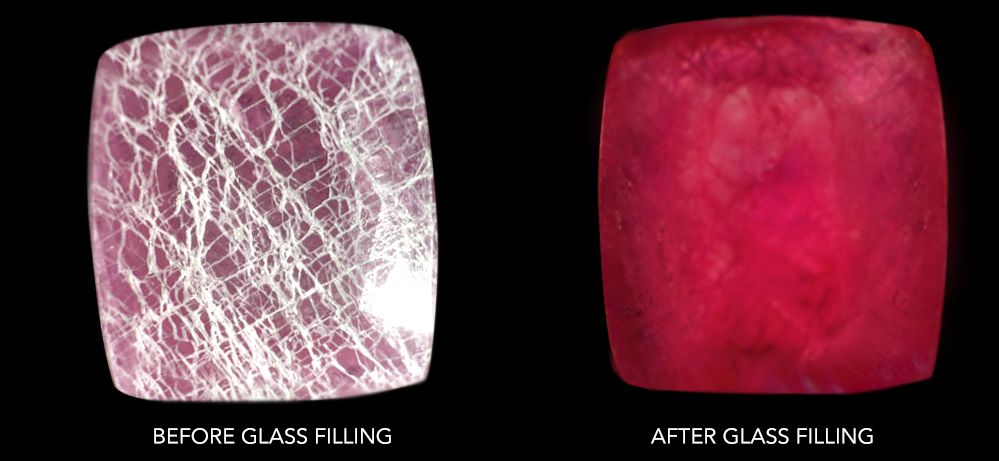 Buyer beware. While the carat weight may be identical, a ruby that has been heat treated will be worth 100 times more than an equivalent weight gem with lead glass filling. So, that could mean $10,000 versus $100 for a stone seemingly identical to the naked eye!