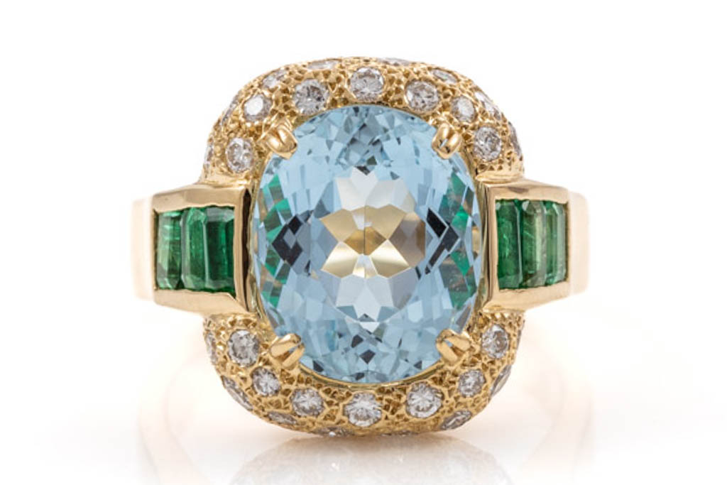 Aquamarine, Emerald and Diamond Ring
