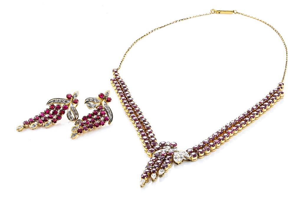 Ruby and Diamond Necklace and Earrings Set