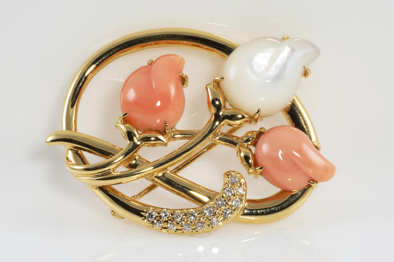 Coral, Shell and Diamond Brooch