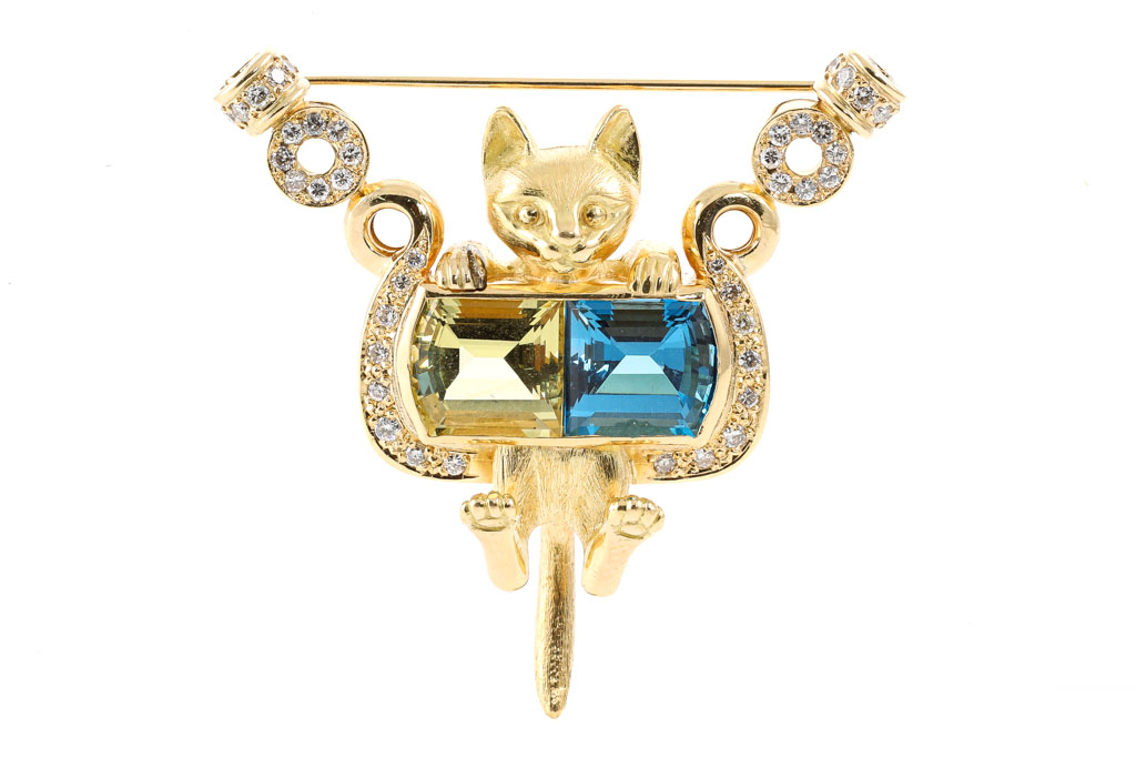 Quartz, Topaz and Diamond Cat Brooch