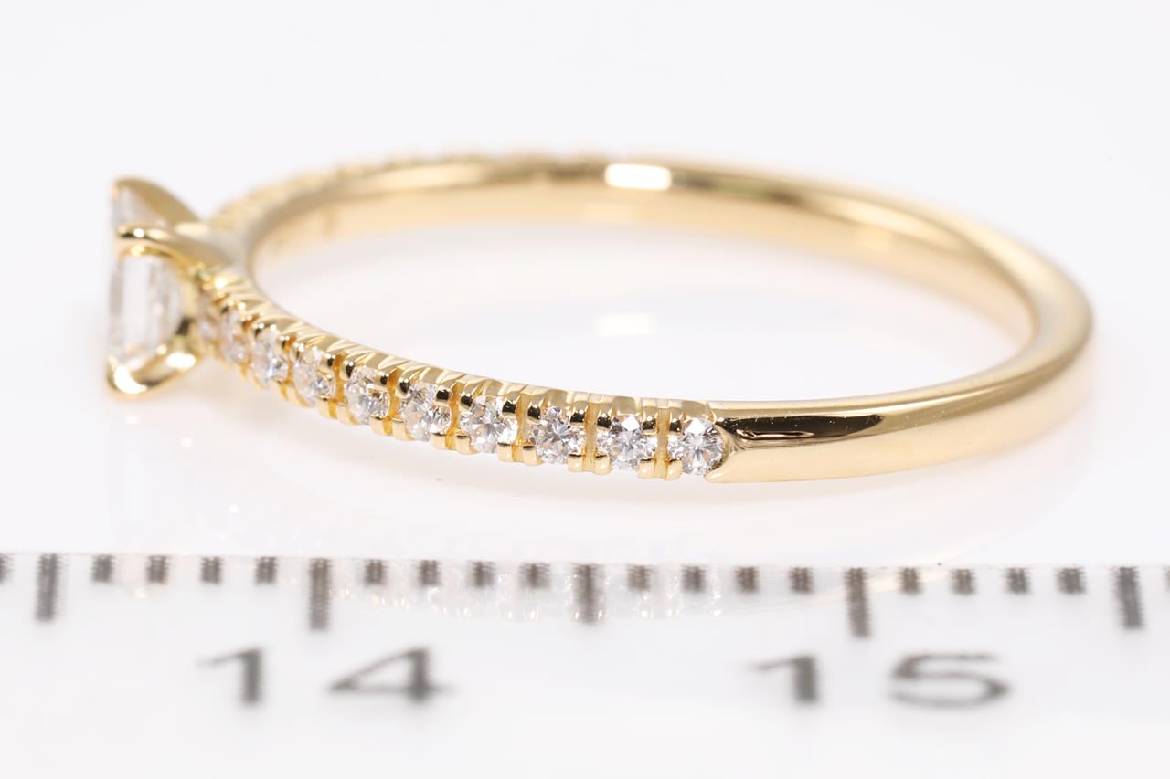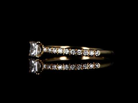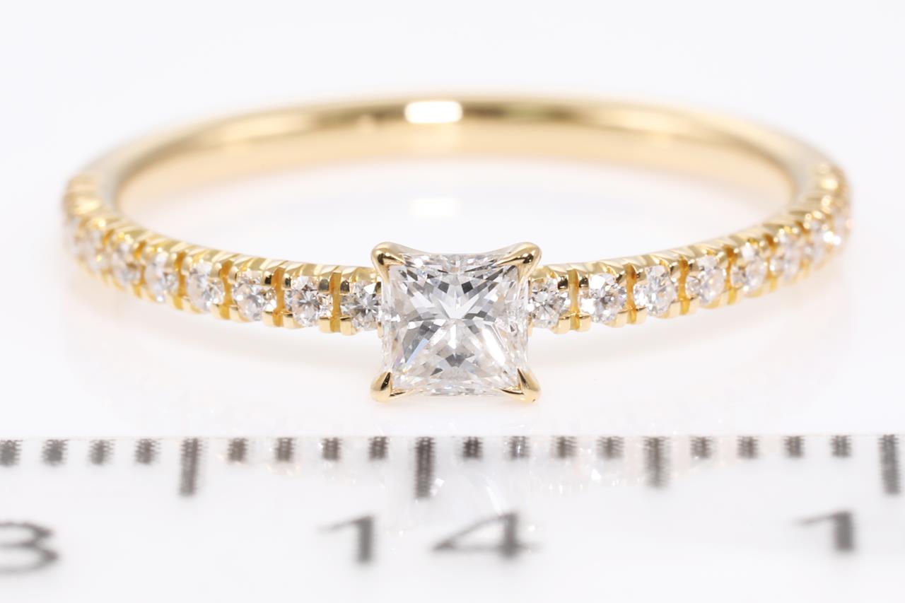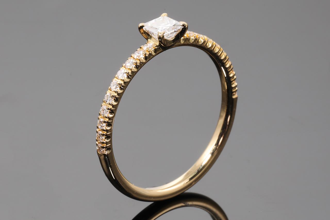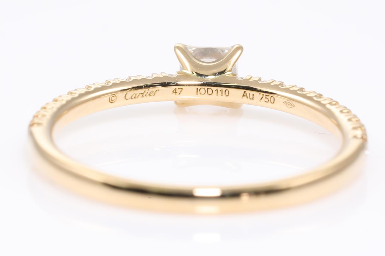 Étincelle de Cartier ring with a centre princess cut Diamond of 0.16ct and shoulder Diamonds totalling 0.10cts. Width: 1.52 mm. Thickness: 1.35 mm. 18ct yellow gold. With Cartier box. Cartier stamped size 47, H - ring resizing is not recommended. Weight: 1.3g. (Pre-owned)