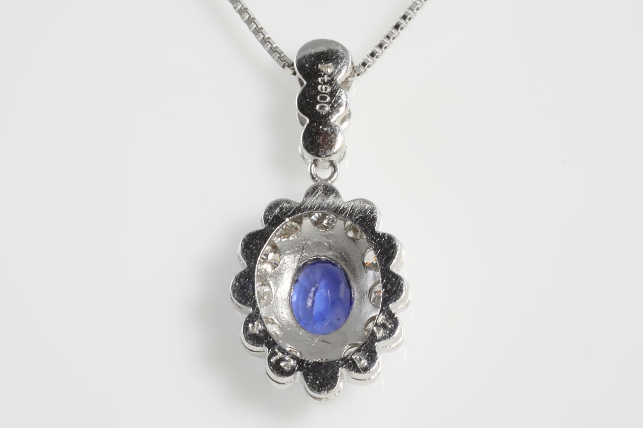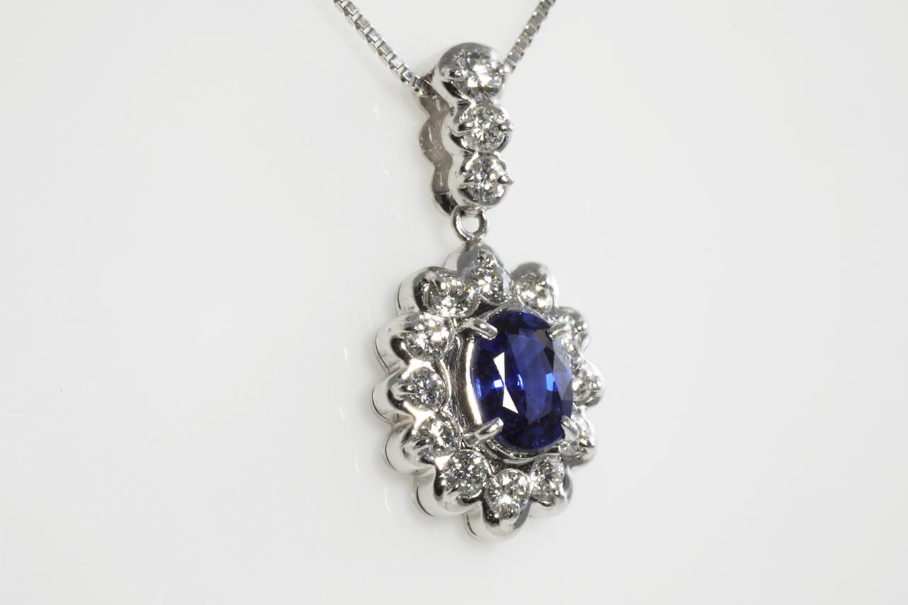 Sapphire and Diamond pendant with oval shape Sapphire of 0.72ct and Diamond totalling 0.47cts. (estimated grading: G VS). Platinum with 18ct white gold adjustable 45cm chain. Weight: 5.6g (Pre-owned)