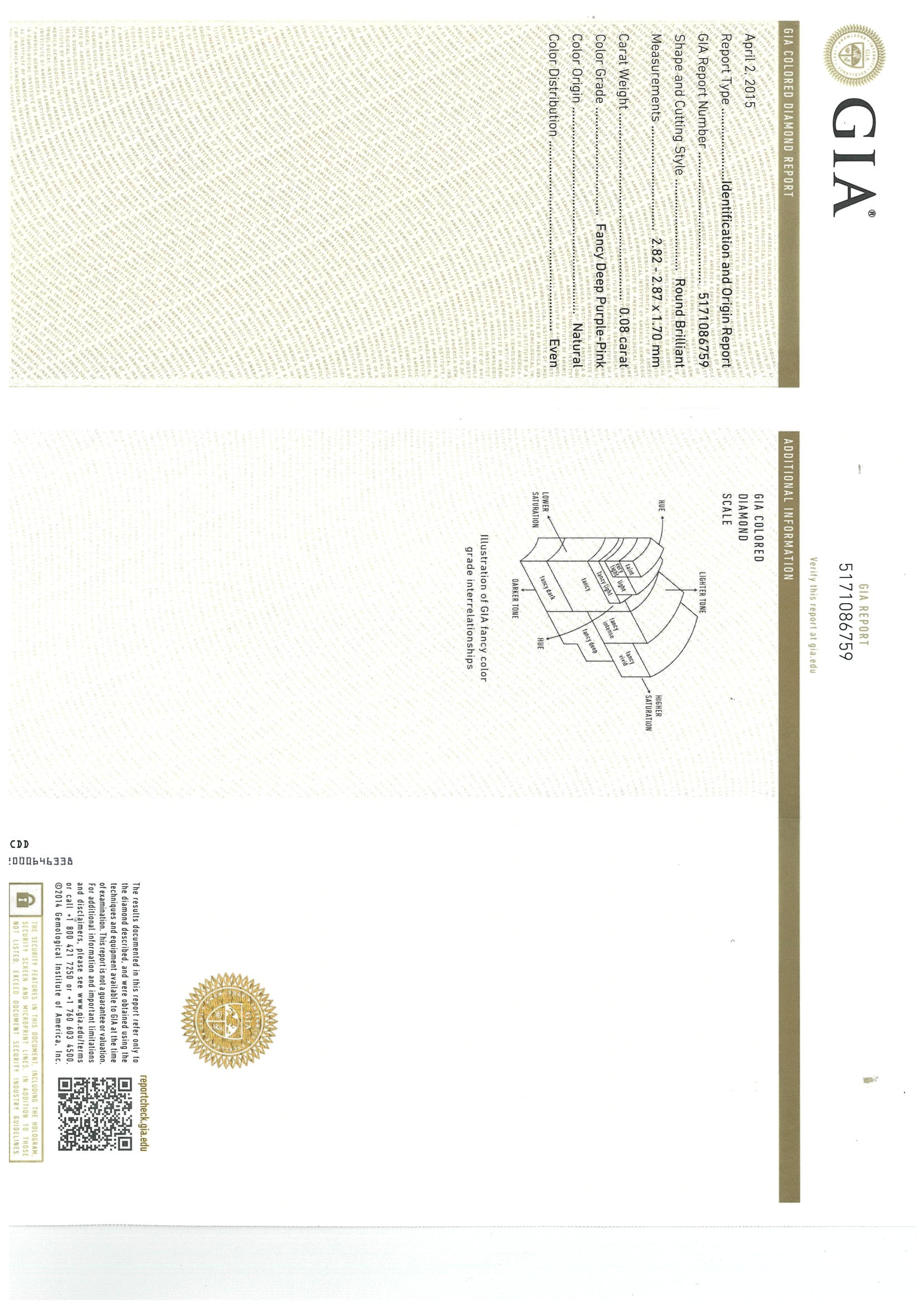 A loose round brilliant cut Diamond of 0.08ct (with GIA report graded as Natural Fancy Deep Purple-Pink Even #5171086759). (New)