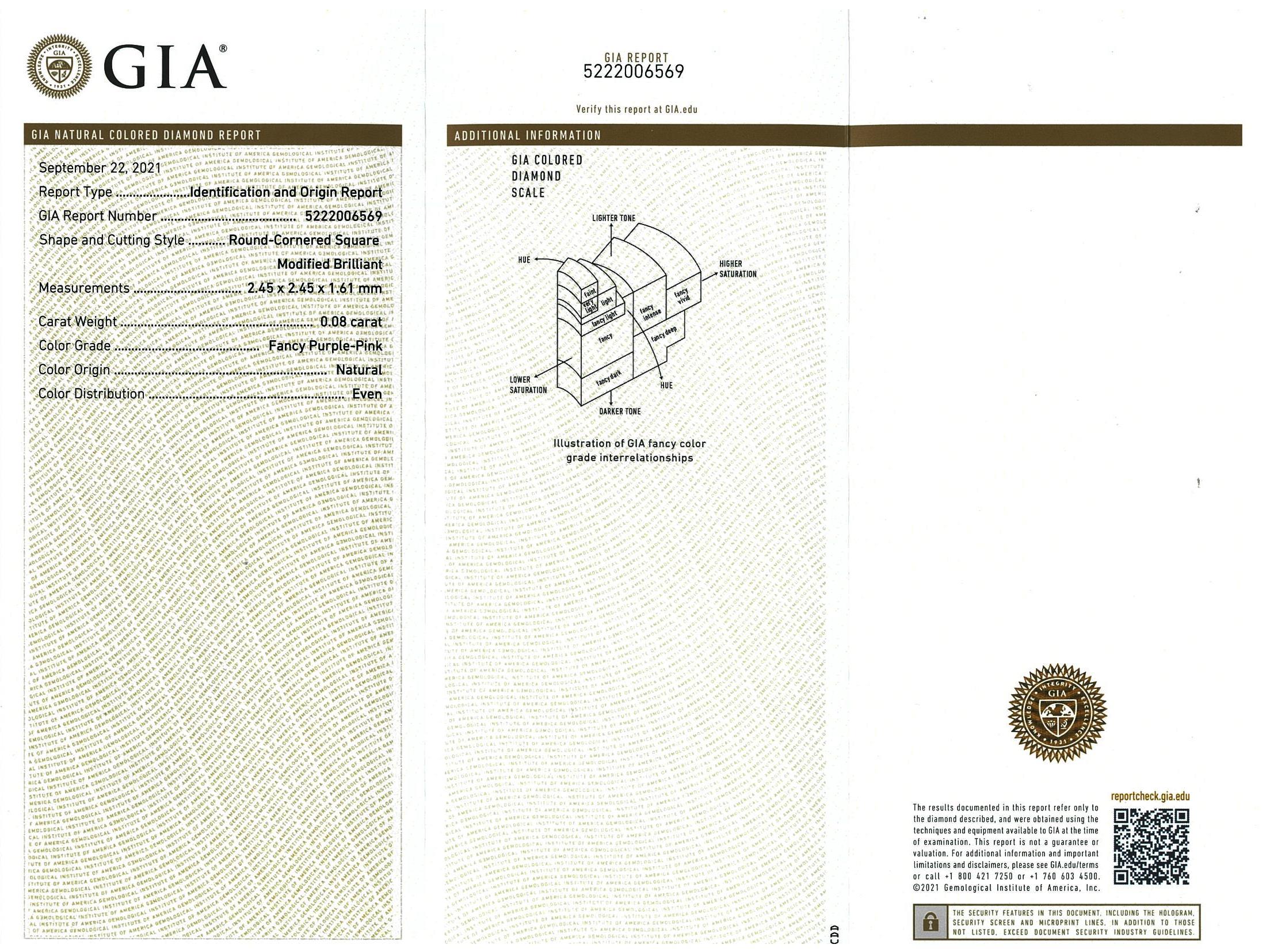 A loose round-cornered square modified cut Diamond of 0.08ct (With GIA report graded as Natural Fancy Purple-Pink Even #5222006569). (New)