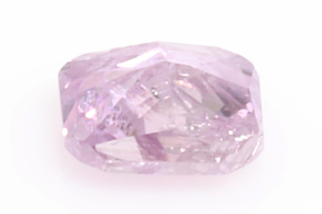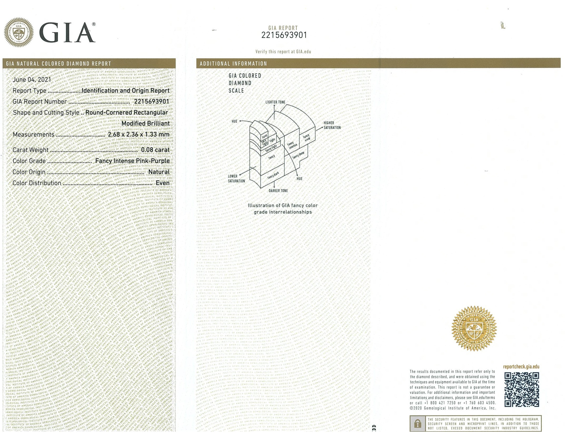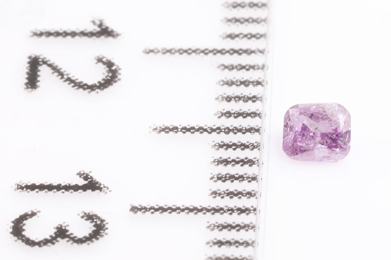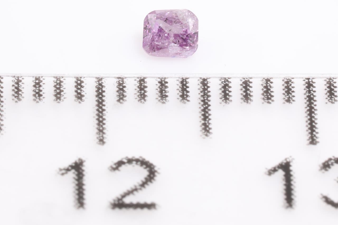 A loose radiant cut (round-cornered rectangular modified brilliant) Diamond of 0.08ct (With GIA report graded as Natural Fancy Intense Pink-Purple Even #2215693901). (New)