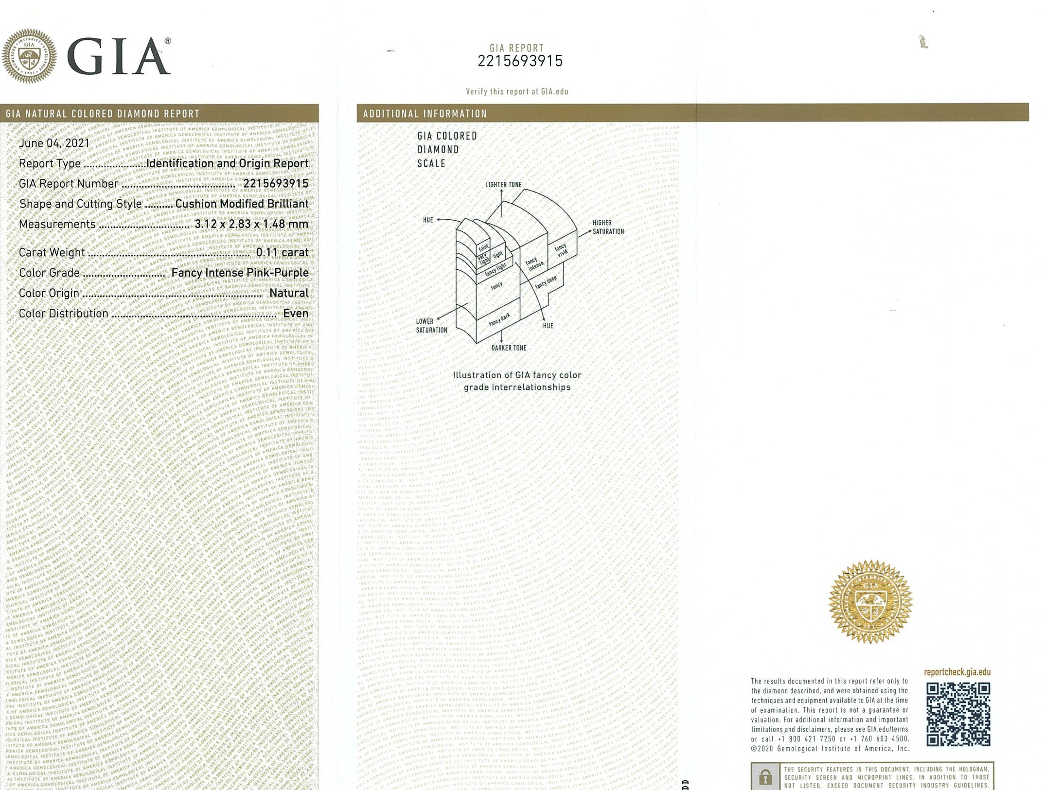 A loose cushion cut Diamond of 0.11ct (With GIA report graded as Natural Fancy Intense Pink-Purple Even #2215693915). (New)