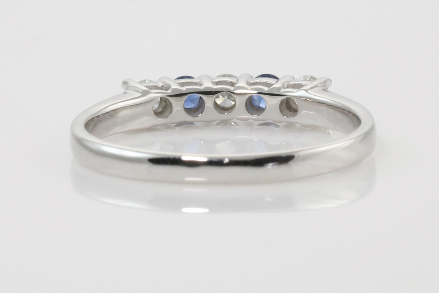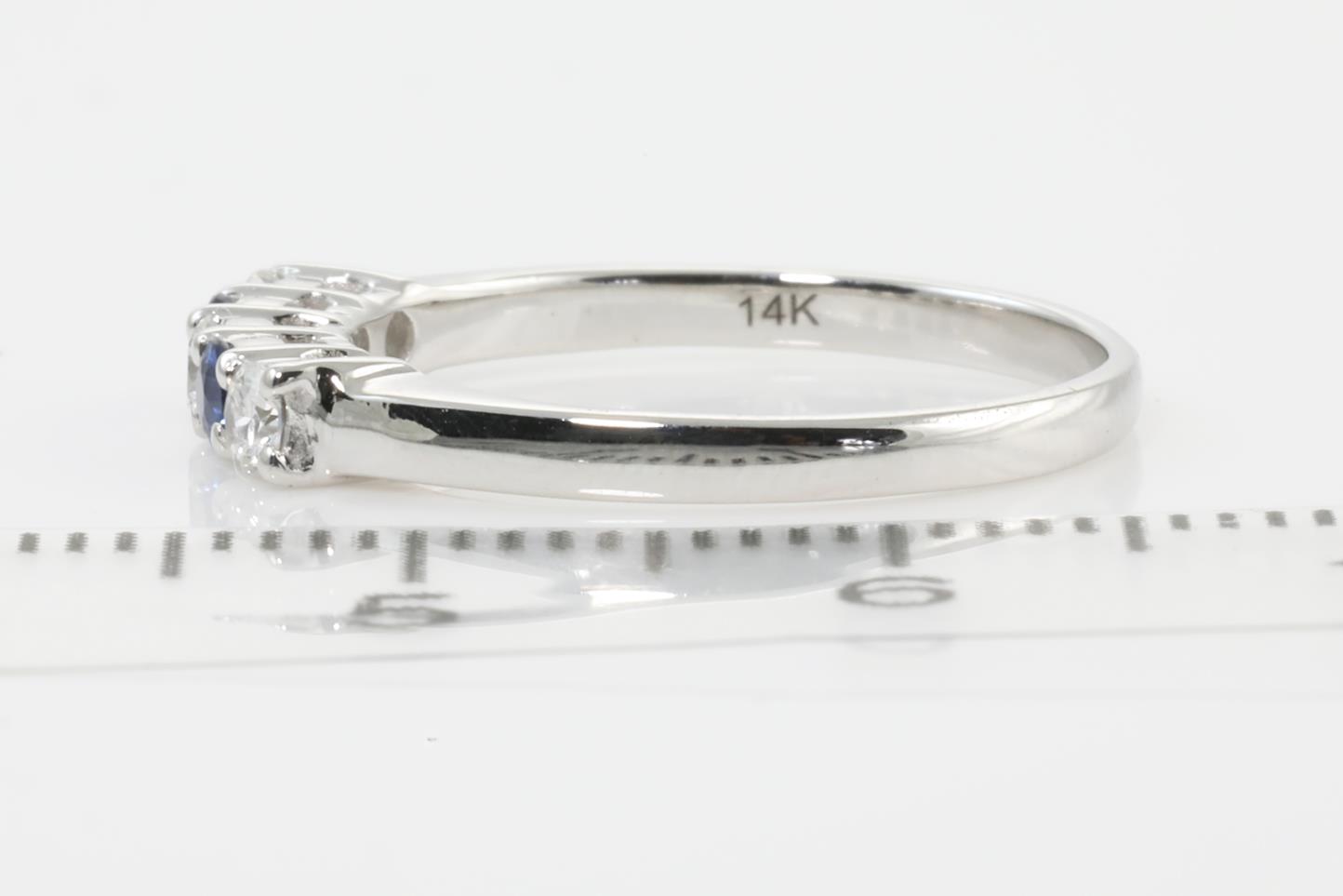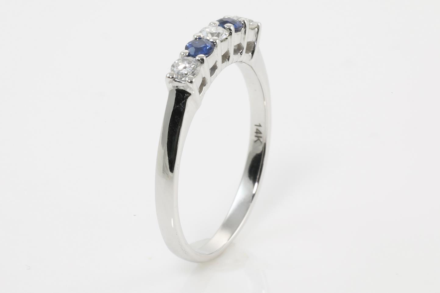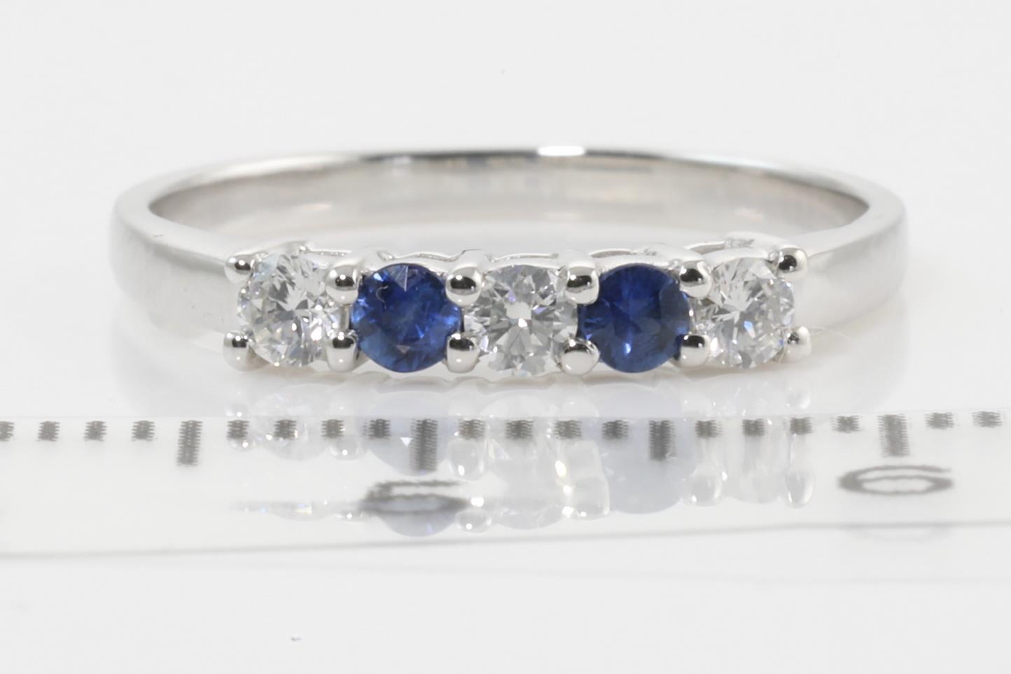 Sapphire and Diamond ring with 2 round blue Sapphires totalling 0.11cts and round Diamonds totalling 0.17cts. 14ct white gold. Ring size K - ring can be resized up by 3 sizes, resizing down only by ring clip. Weight: 1.9g (As New)