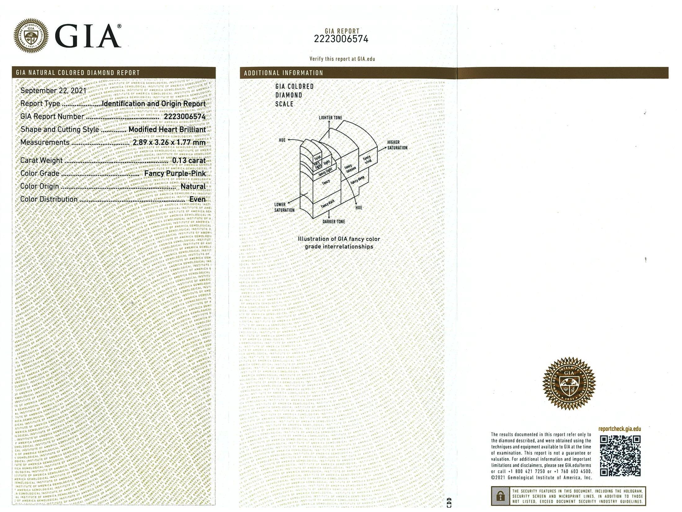 A loose heart shaped Diamond of 0.13ct (With GIA report graded as Natural Fancy Purple- Pink Even #2223006574). (New)