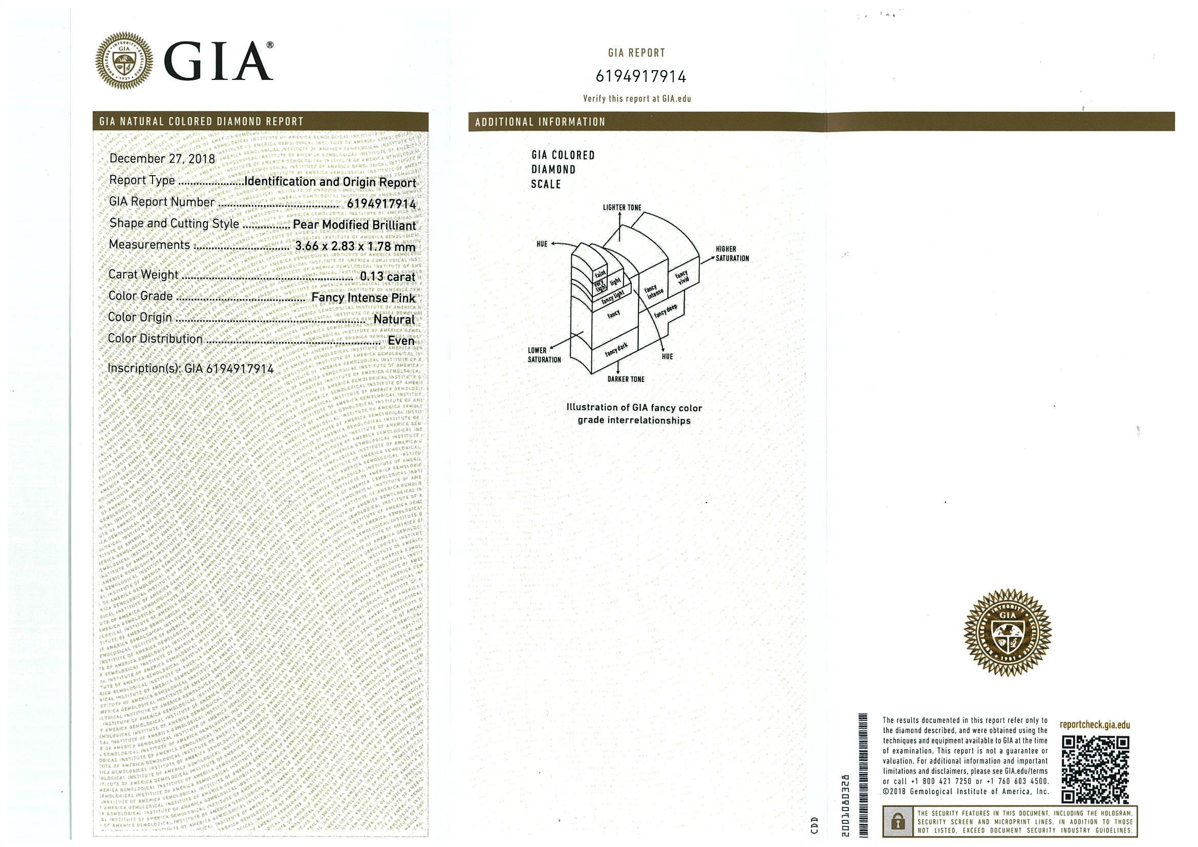 A loose Pear shape Diamond of 0.13ct (with GIA report graded as Natural Fancy Intense Pink Even # 6194917914). (new)