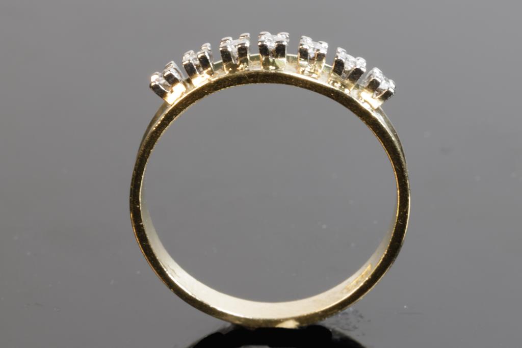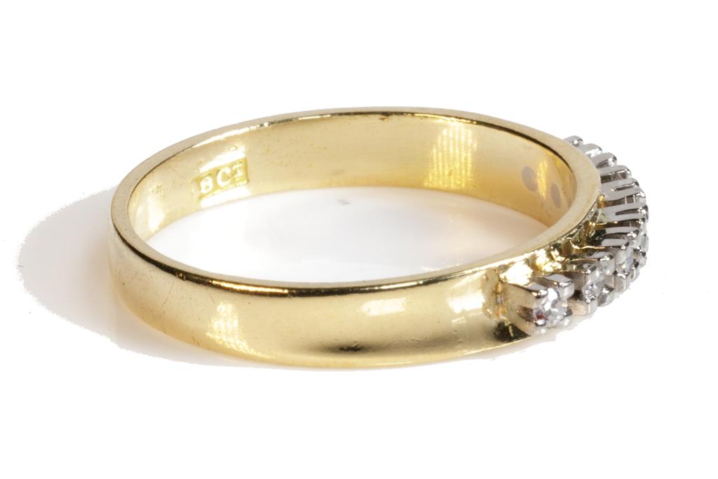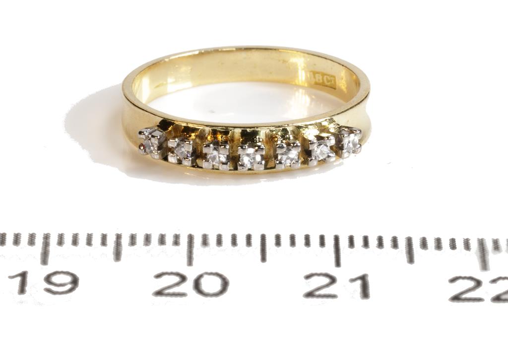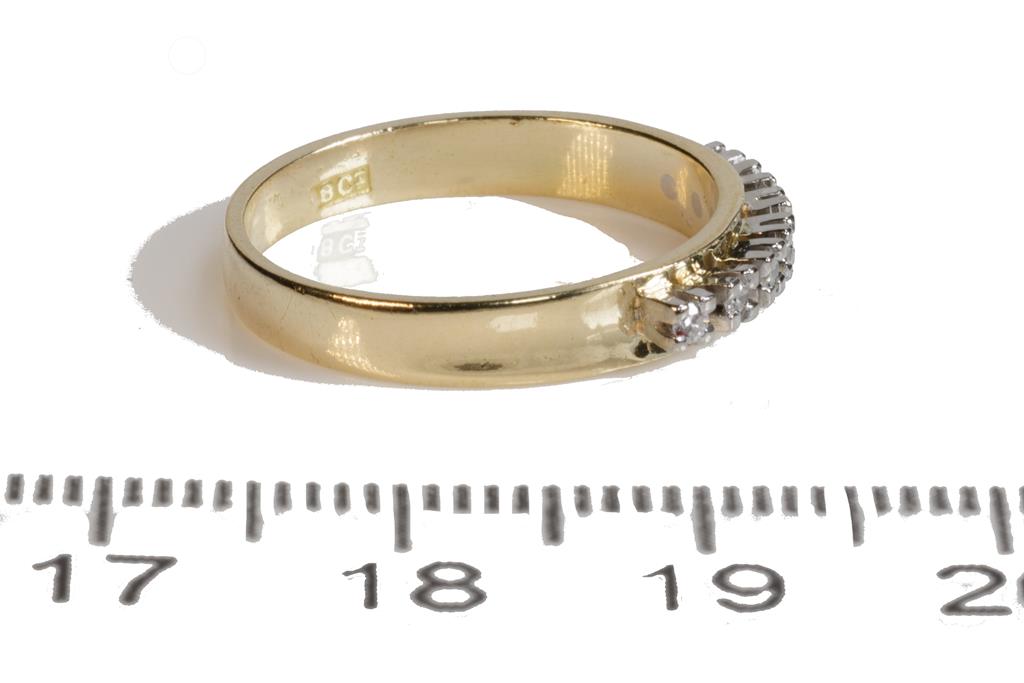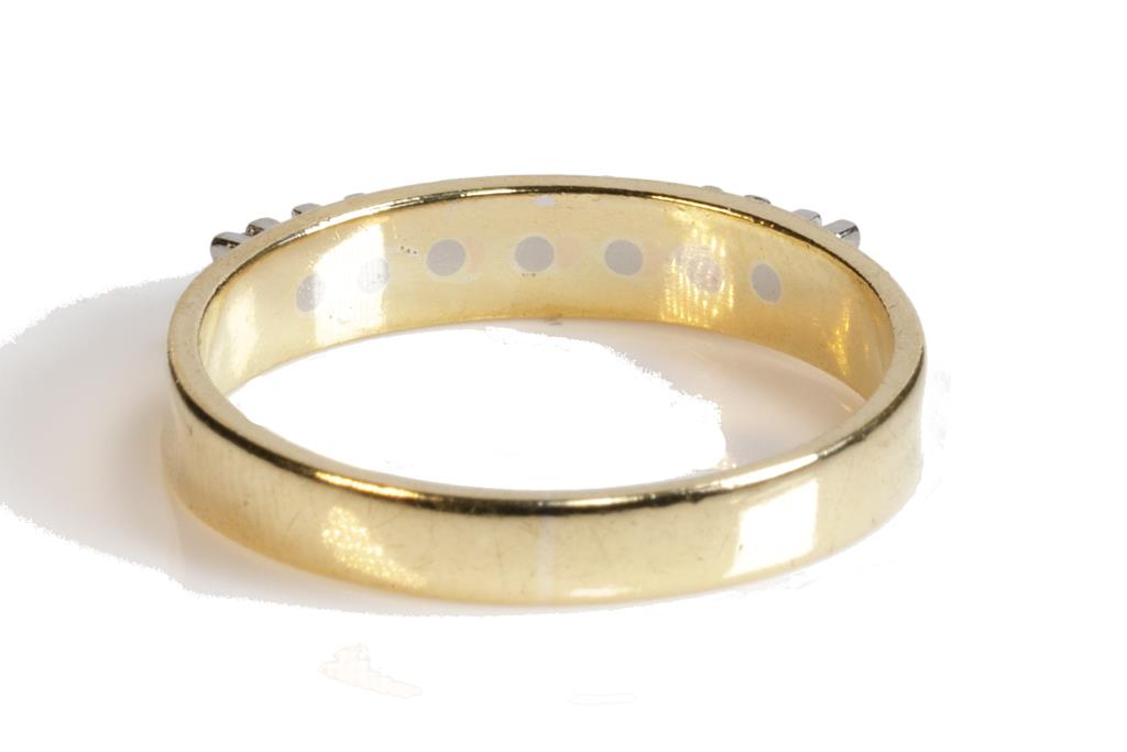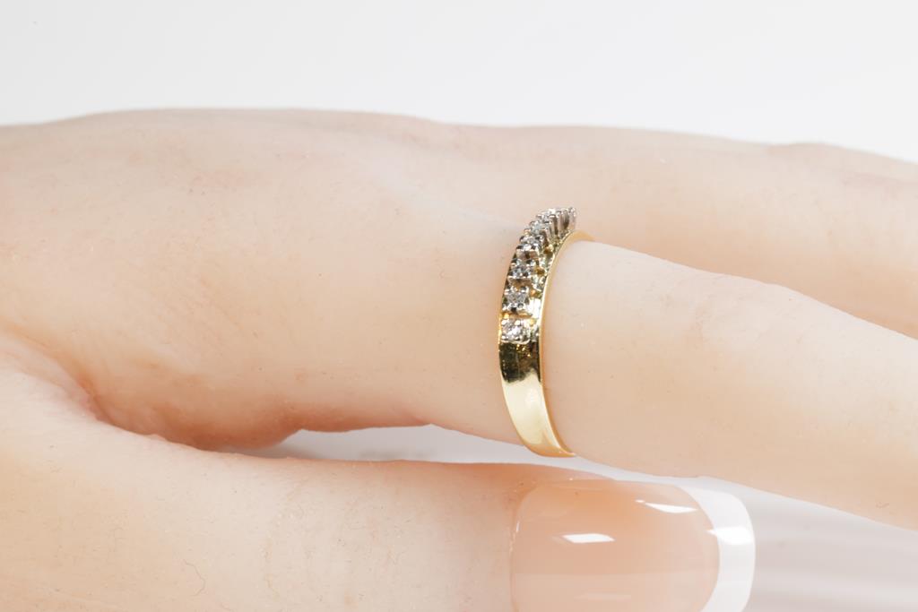 Diamond eternity ring with 7 round Diamonds totalling approximately 0.14cts. 18ct yellow and white gold. Ring size L 1/2. Weight 2.6g. (Pre-owned)