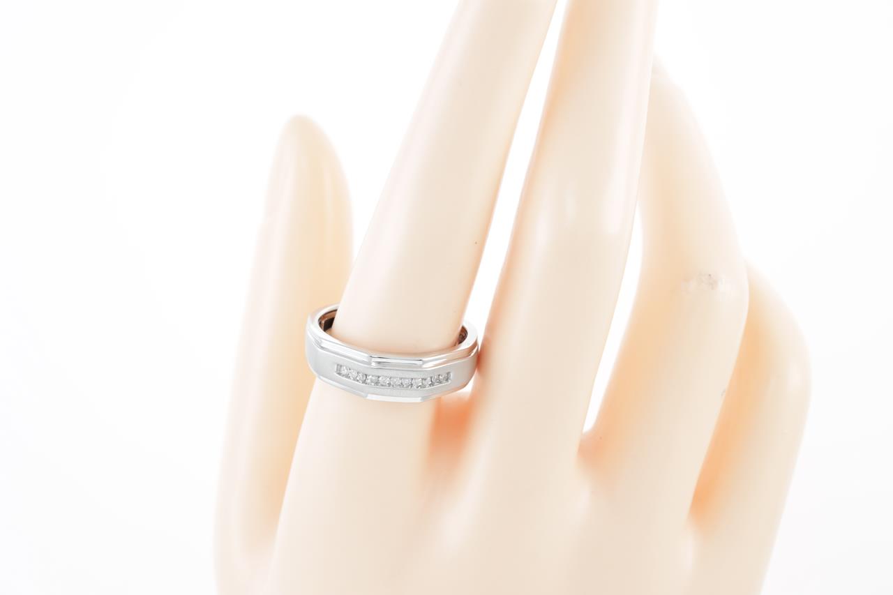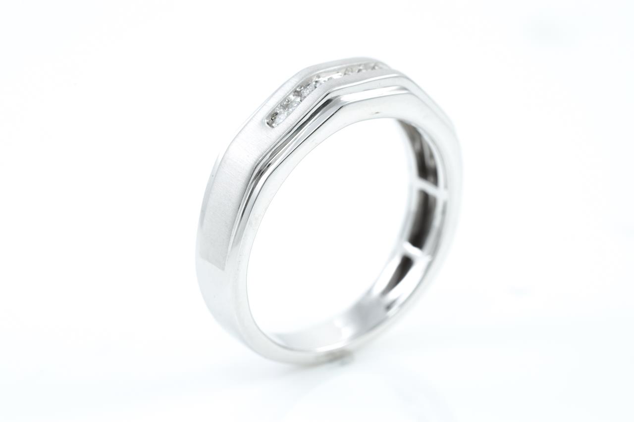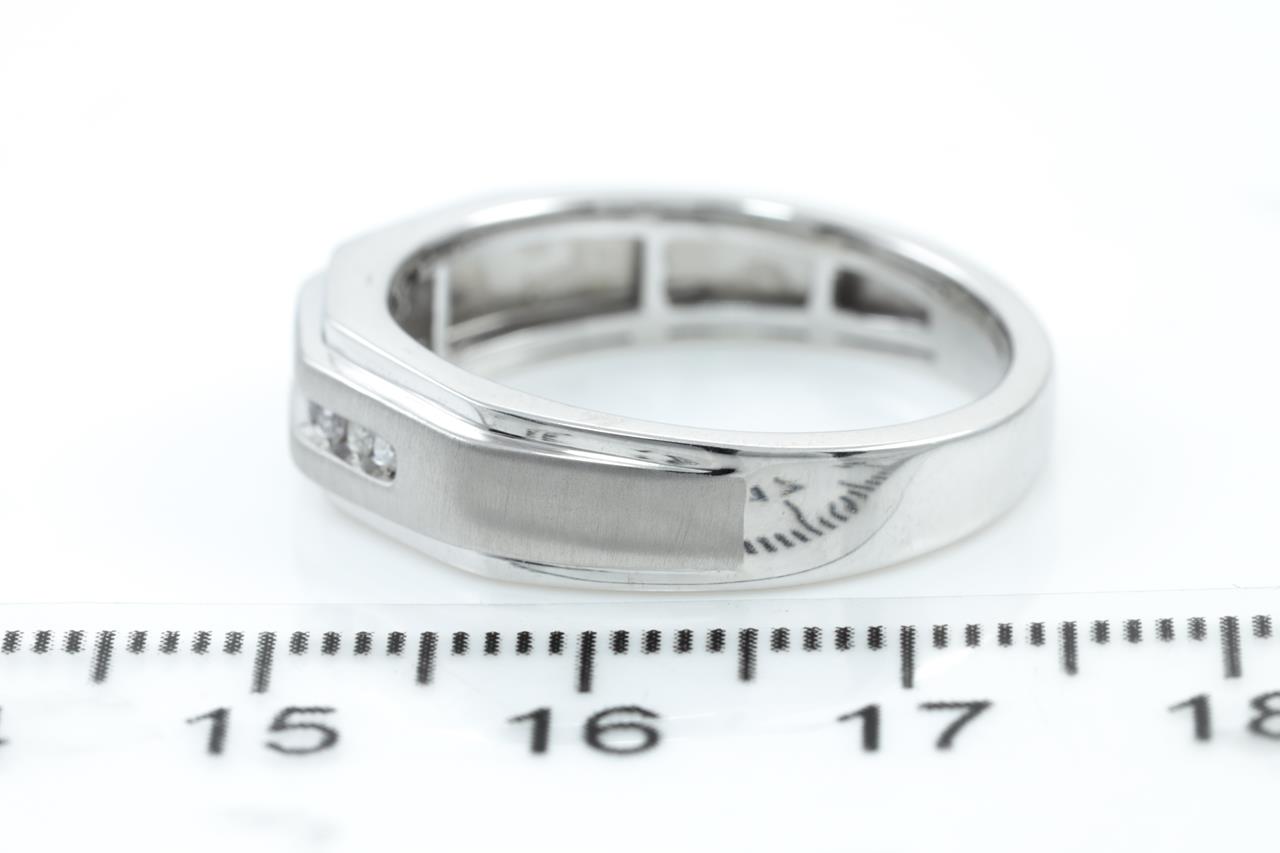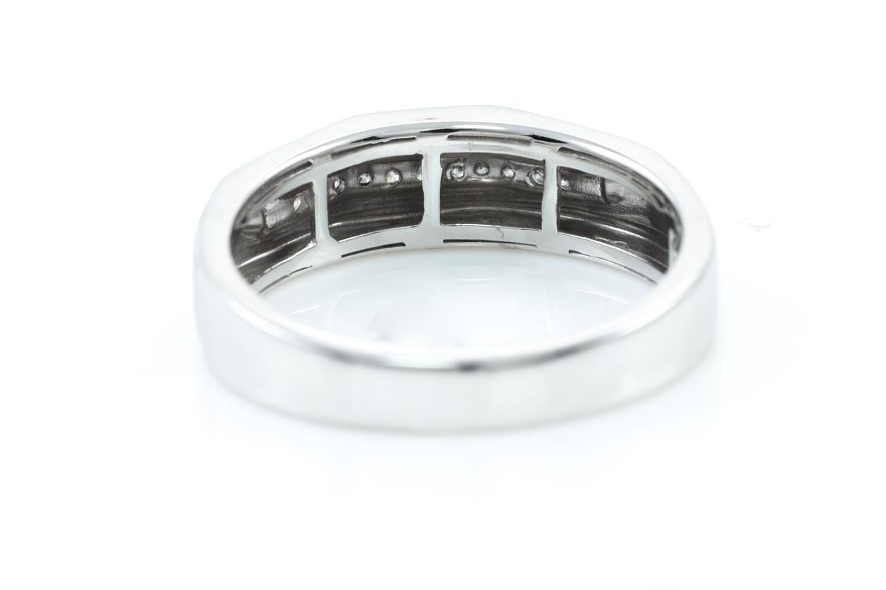 Mens ring with eleven round Diamonds totalling approximately 0.15cts. 10ct white gold with bright and frosted finish. Ring size T. Weight: 4.1g. (As New)
