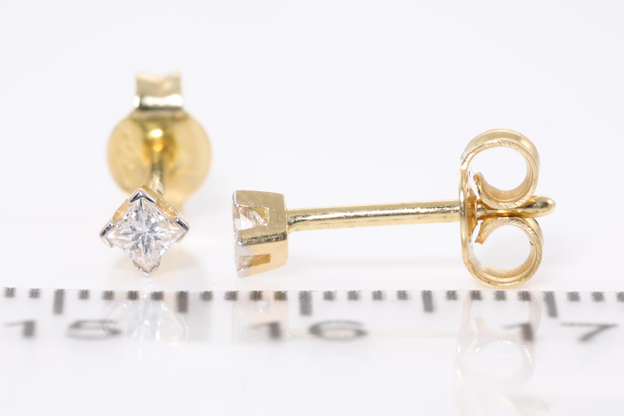 Diamond stud earrings with princess cut Diamonds totalling 0.15cts (Estimated grading: G-H VS-SI). 18ct yellow gold. Weight: 0.9g. (As New)