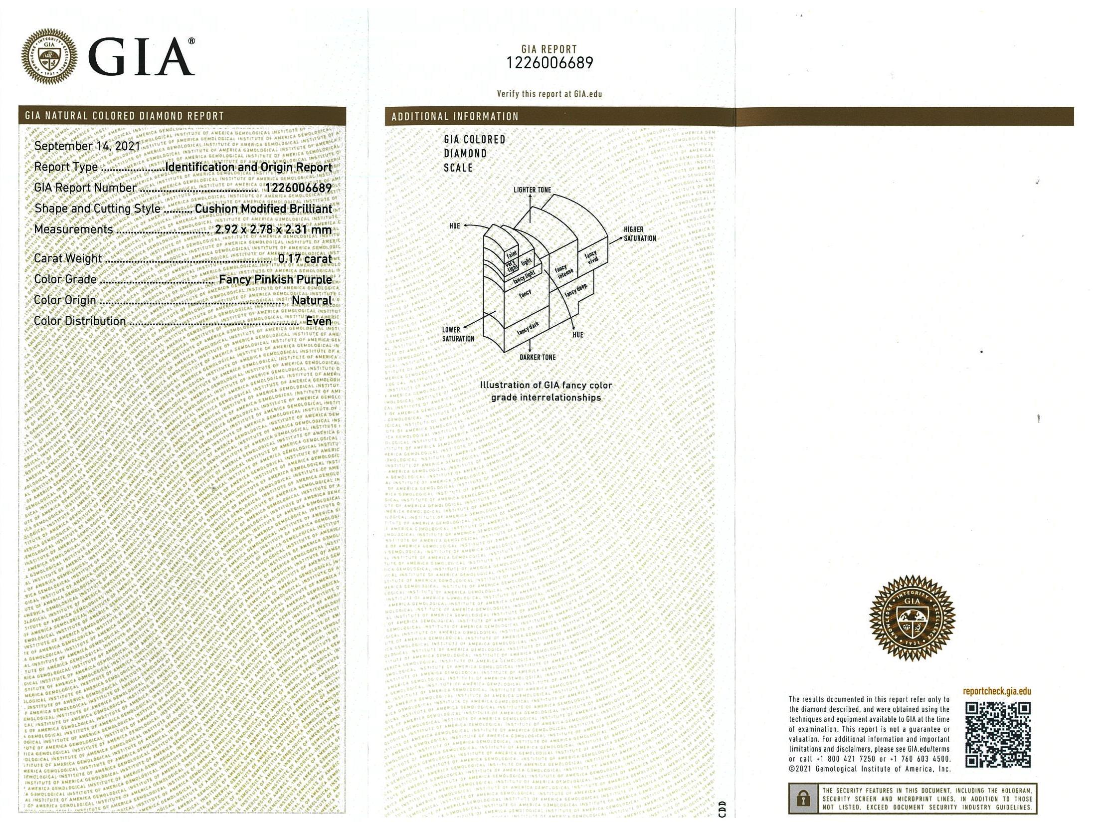 A loose cushion cut Diamond of 0.17ct (With GIA report graded as Natural Fancy Pinkish Purple Even #1226006689). (New)