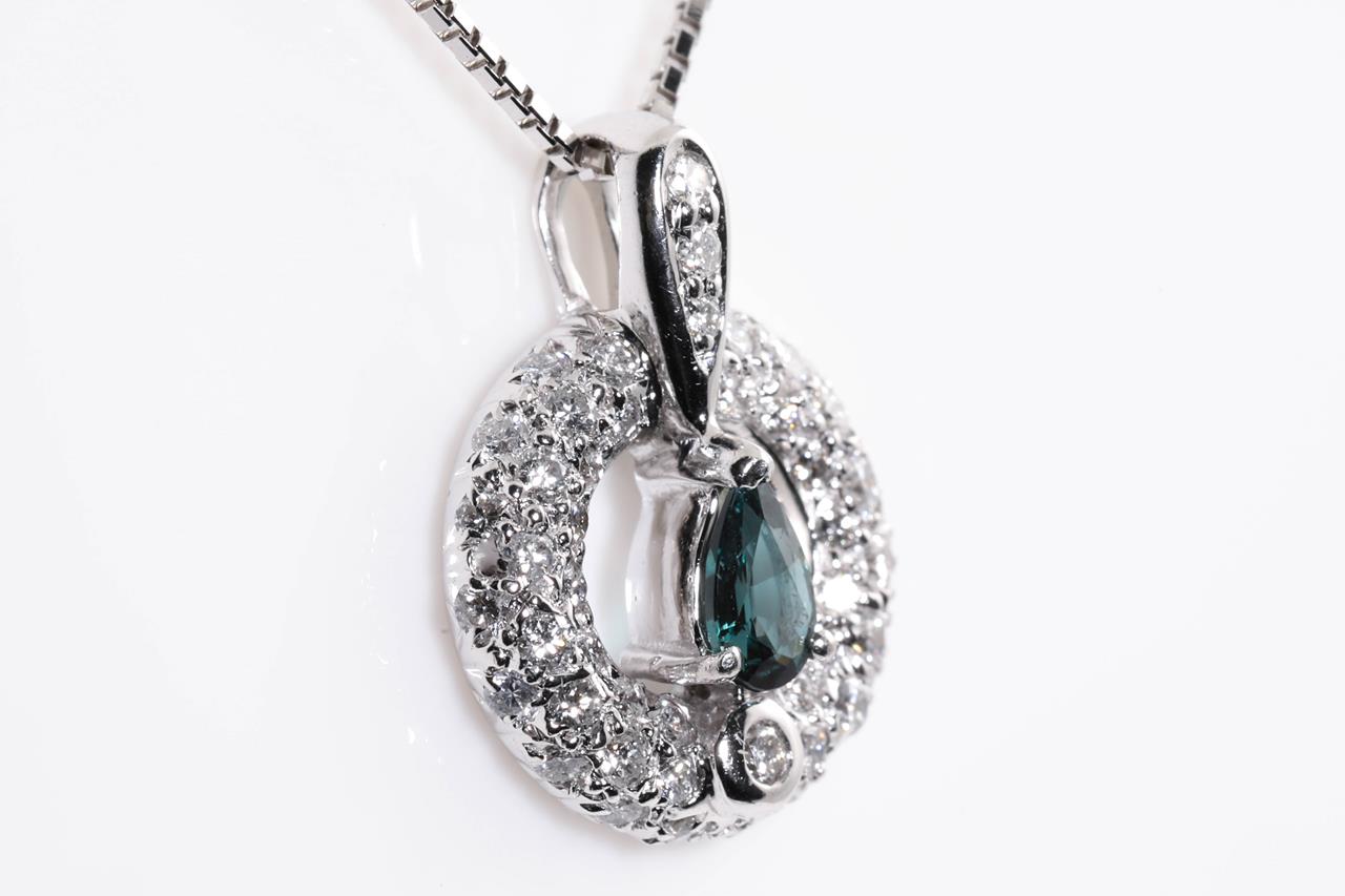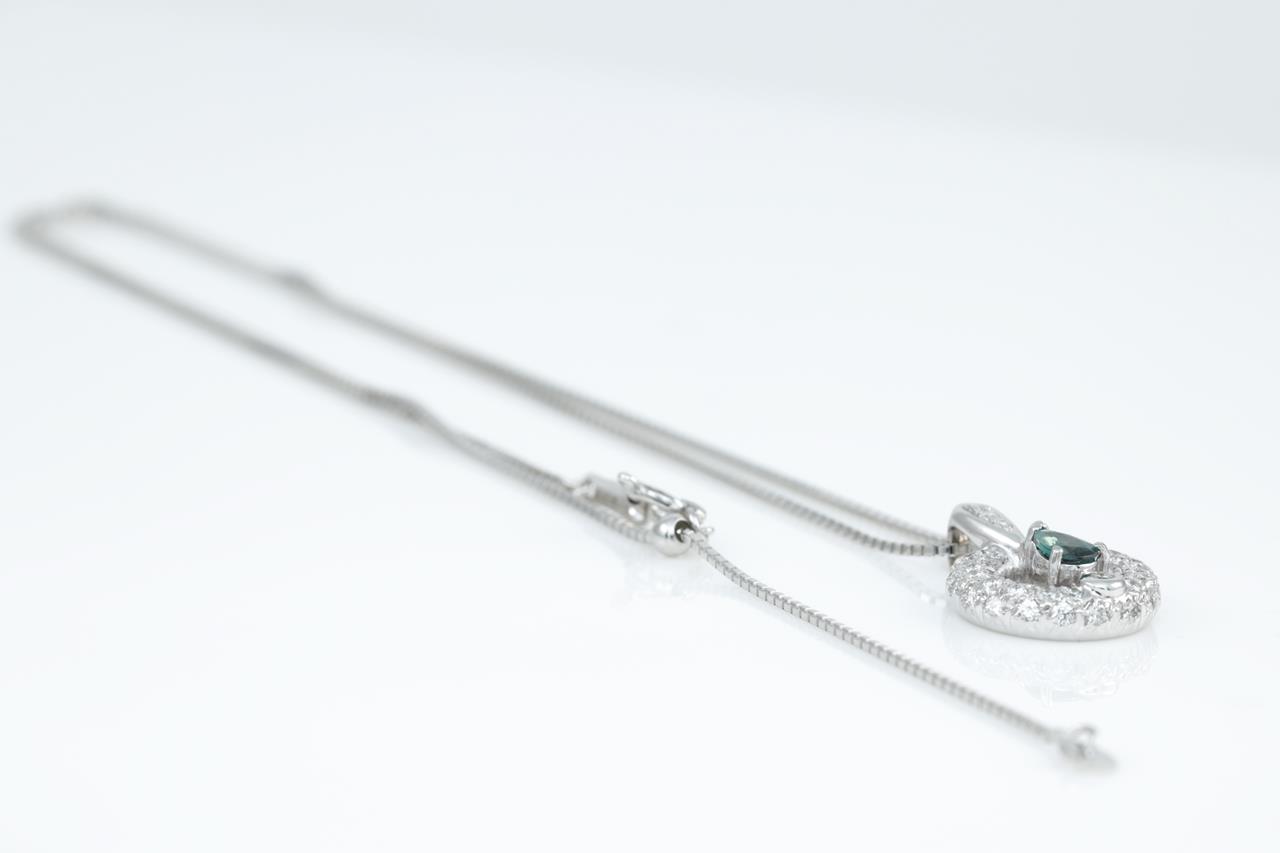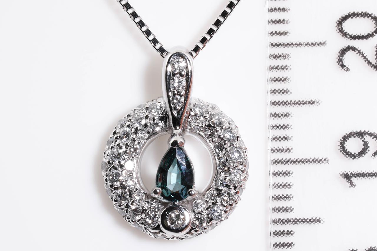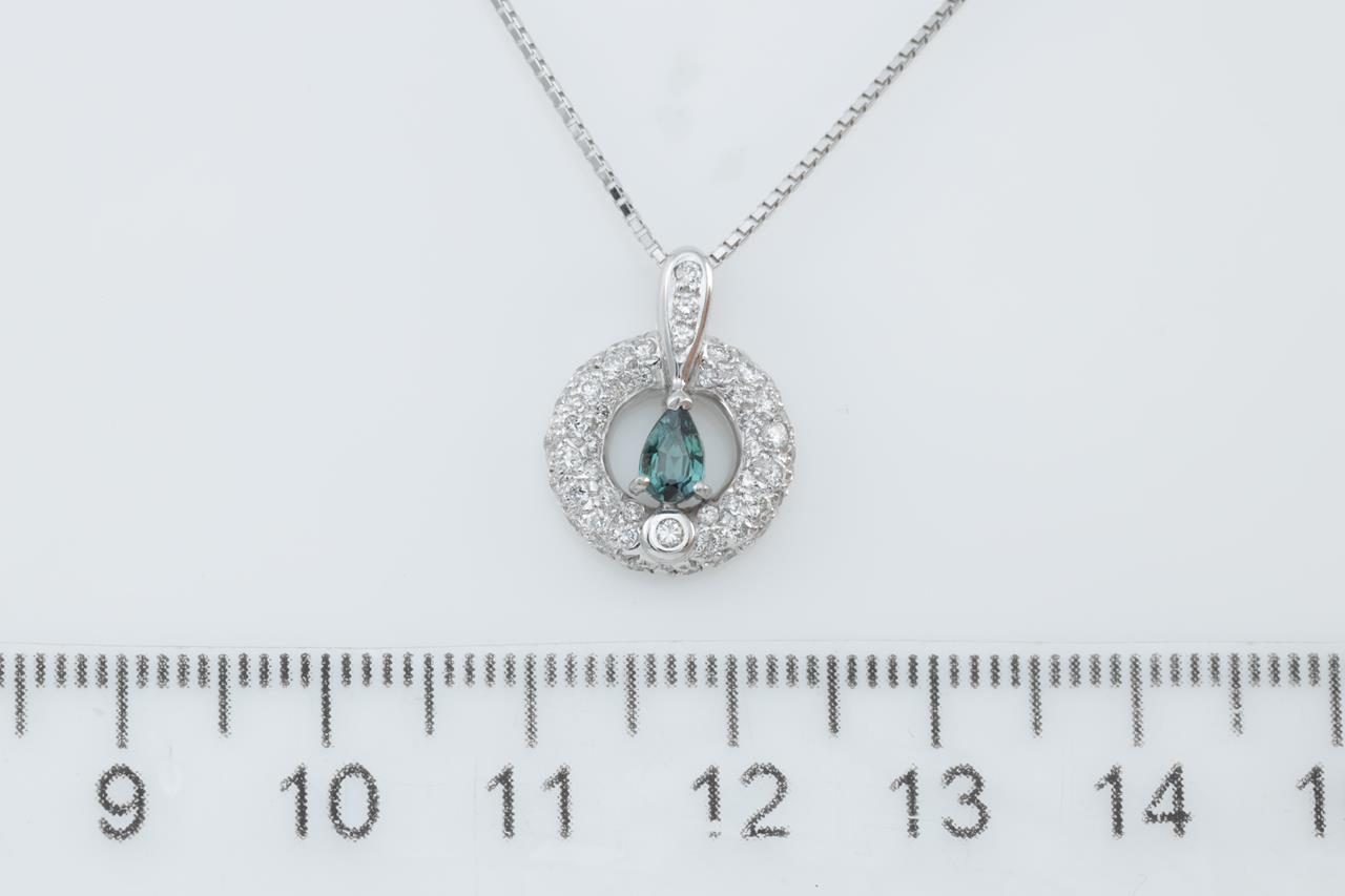 Alexandrite and Diamond pendant with pear shape Alexandrite of 0.18ct (colour change from blueish green to pinkish green) and Diamonds 0.41cts (Estimated grading: G SI). Platinum with 44cm 18ct white gold adjustable chain. Weight: 3.5g (Pre-owned)