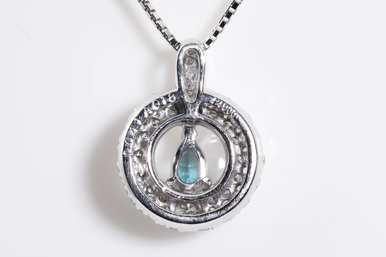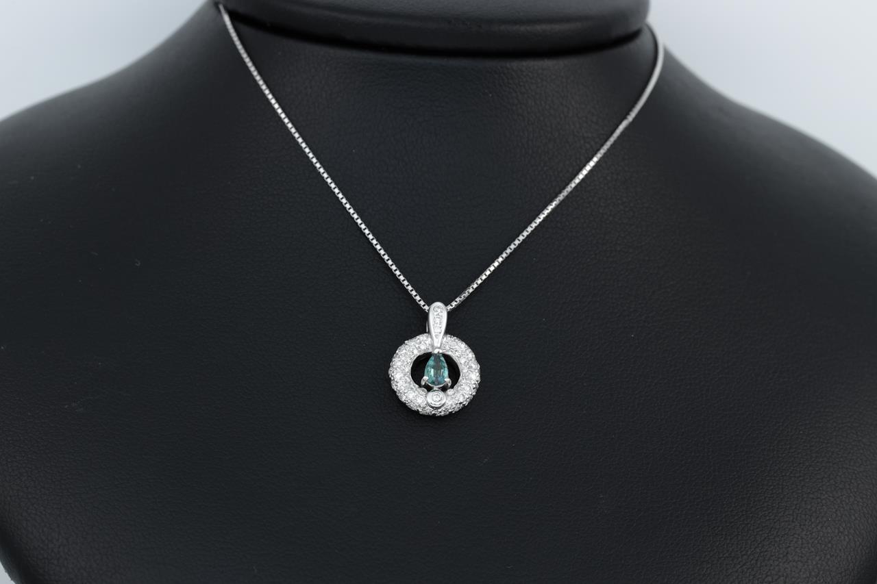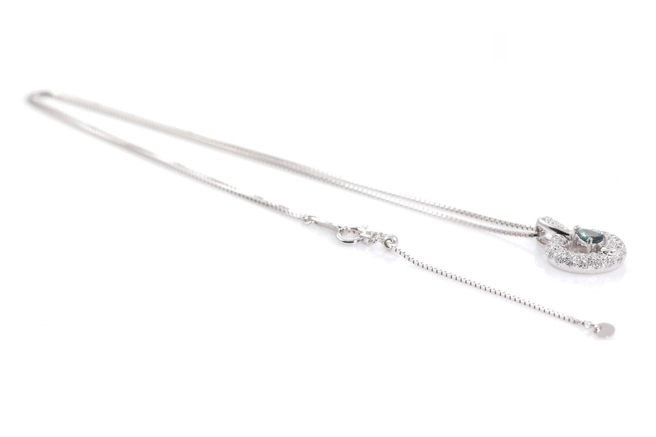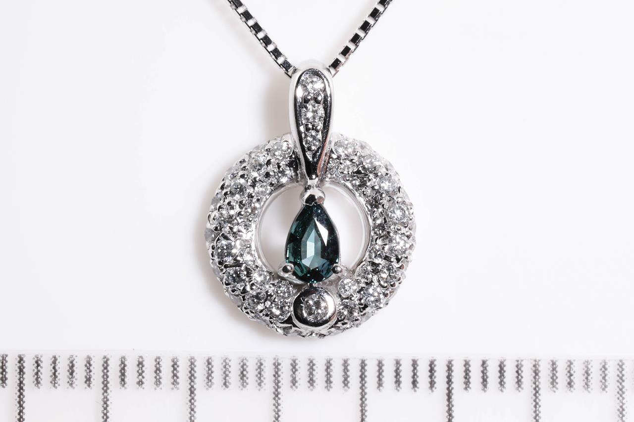 Alexandrite and Diamond pendant with pear shape Alexandrite of 0.18ct (colour change from blueish green to pinkish green) and Diamonds 0.41cts (Estimated grading: G SI). Platinum with 44cm 18ct white gold adjustable chain. Weight: 3.5g (Pre-owned)
