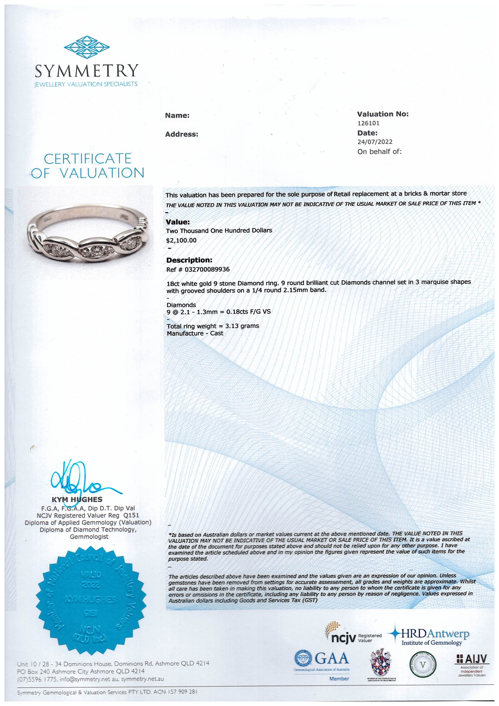 Diamond dress ring with 9 round Diamonds totalling 0.18cts. 18ct white gold. Ring size L. Weight: 3.1g. With Valuation #0327700089936. (Pre-owned)