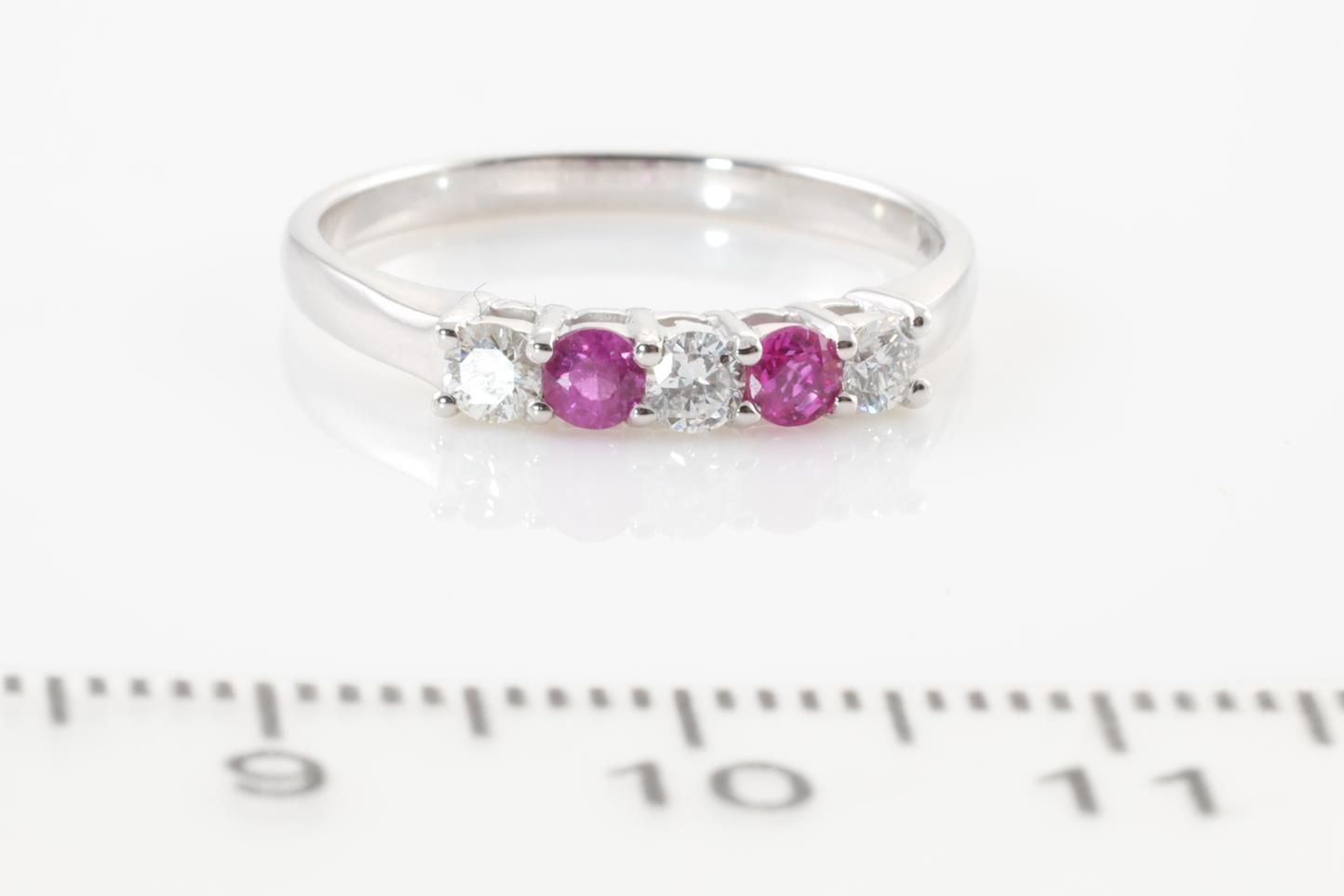 Ruby and Diamond ring with round Rubies totalling 0.18cts and round Diamonds totalling 0.18cts. 14ct white gold. Ring size K - ring can only be resized down with ring clip. Weight: 1.9g (As New)