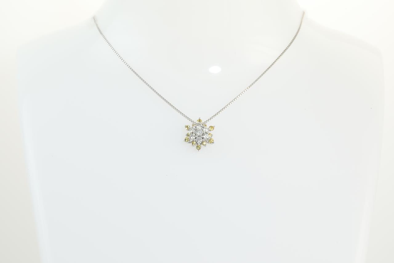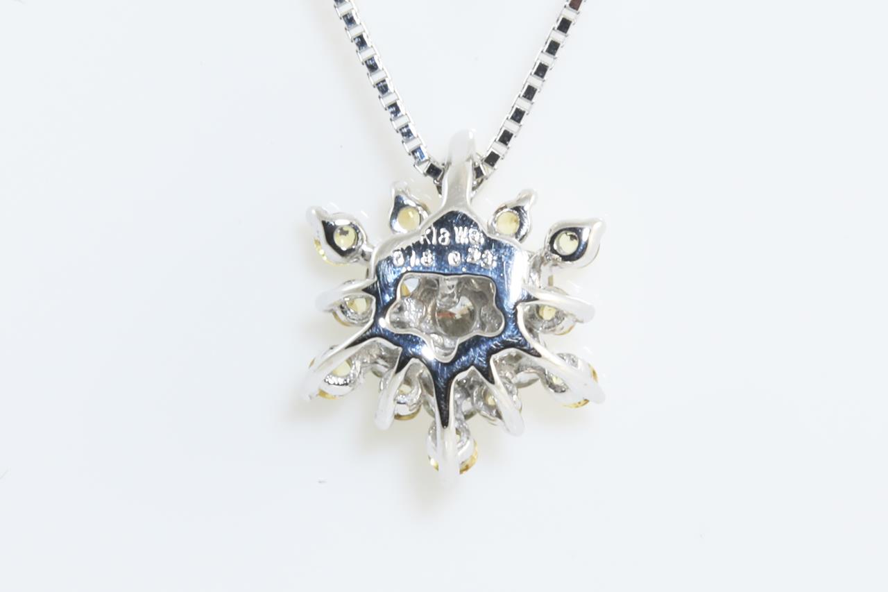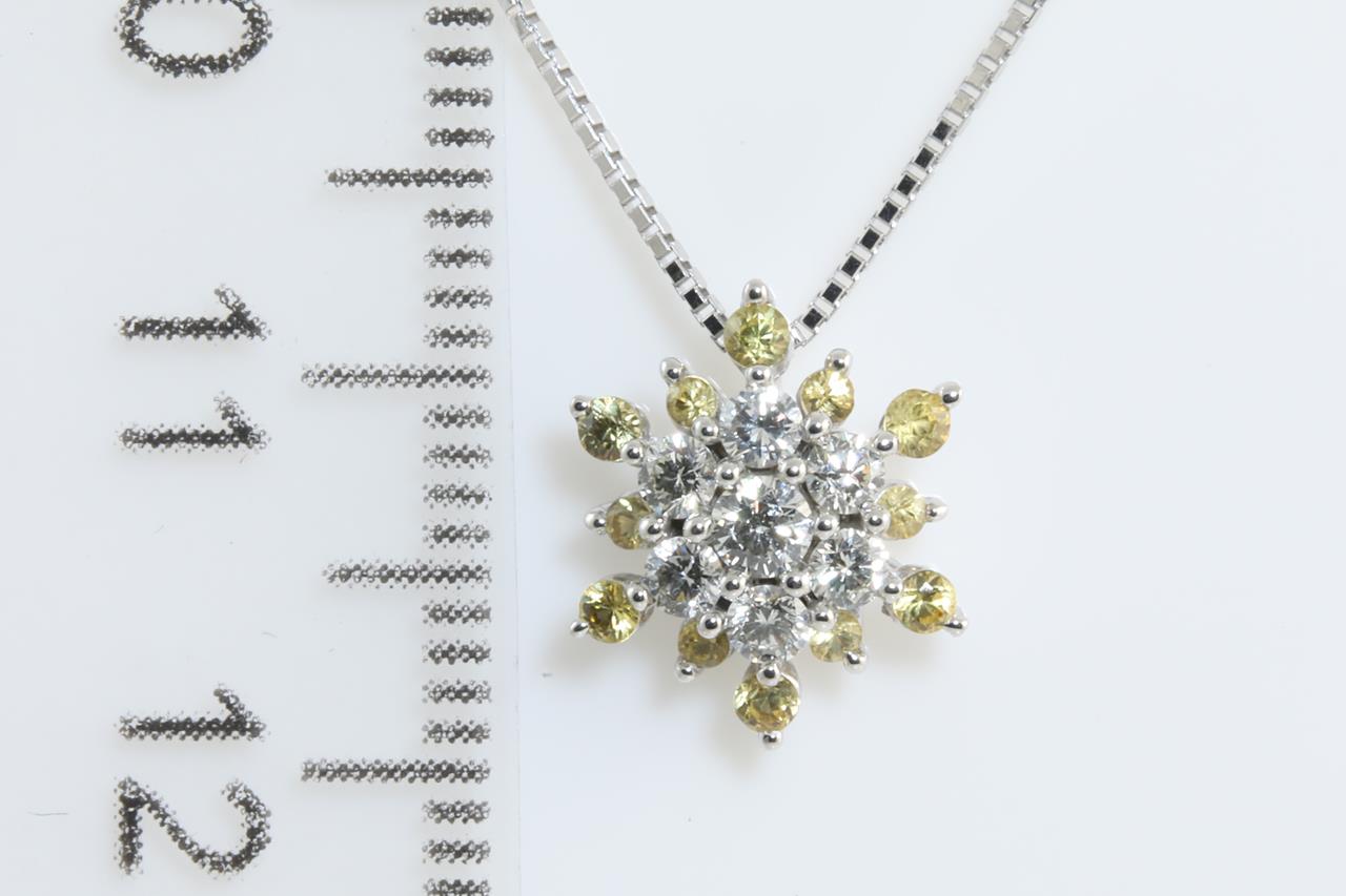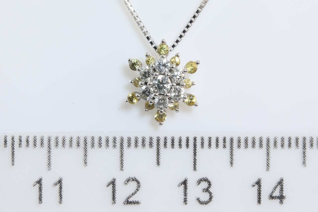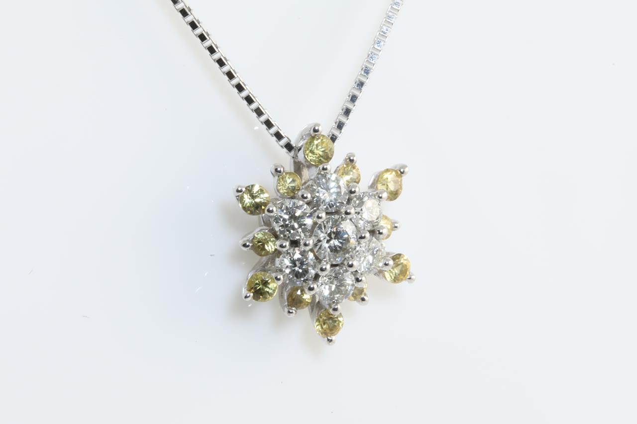 Sapphire and Diamond pendant with round yellow Sapphires totalling 0.18cts and Diamonds totalling 0.23cts. 18ct white gold with 18ct gold 45cm adjustable chain. Weight: 2.7g (Pre-owned)