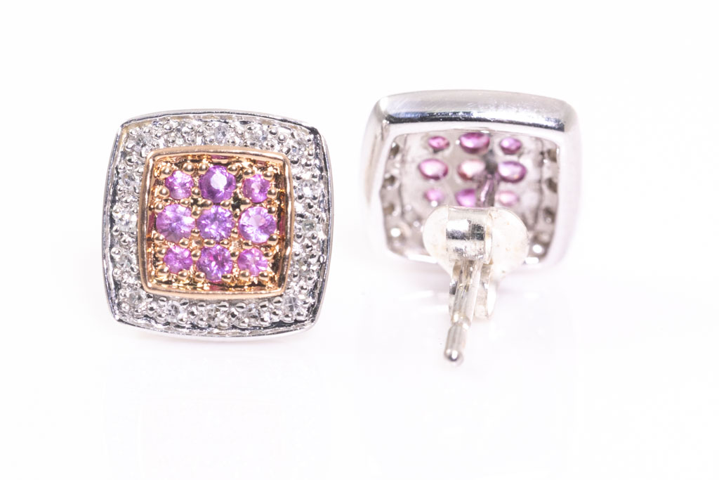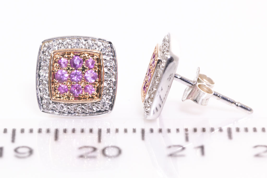 Sapphire and Diamond earrings with round pink Sapphires totalling approximately 0.18cts and Diamonds totalling approximately 0.12cts. 9ct yellow and White gold, Weight: 2g. (Pre-owned)