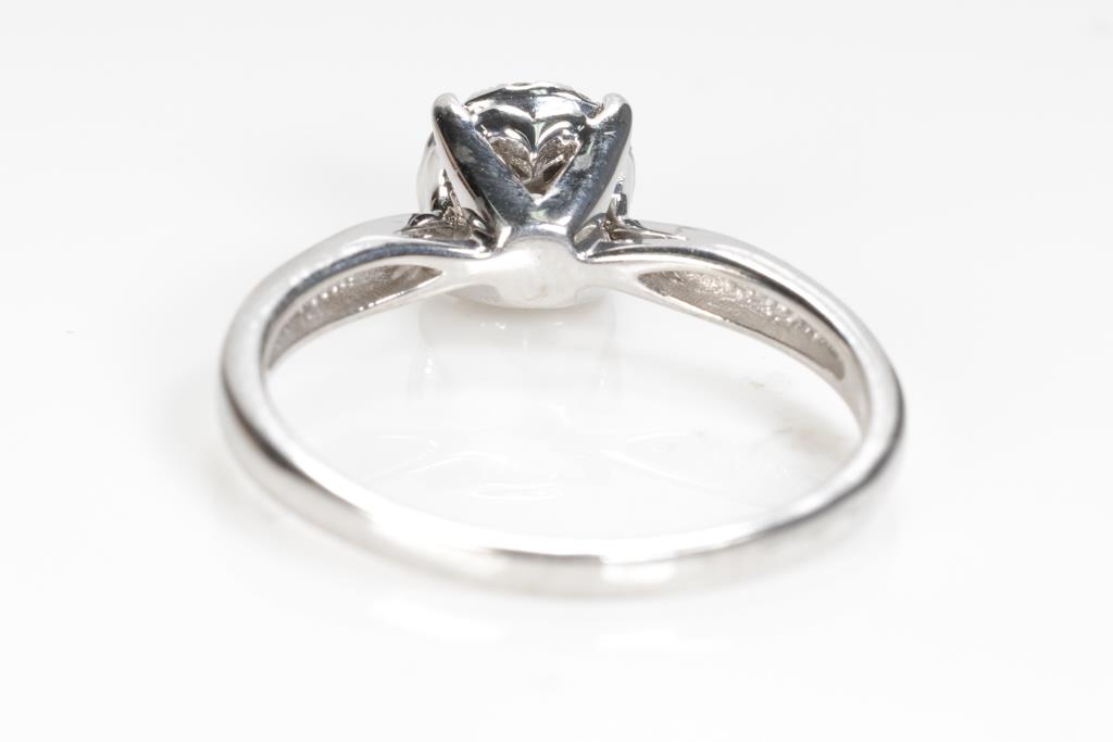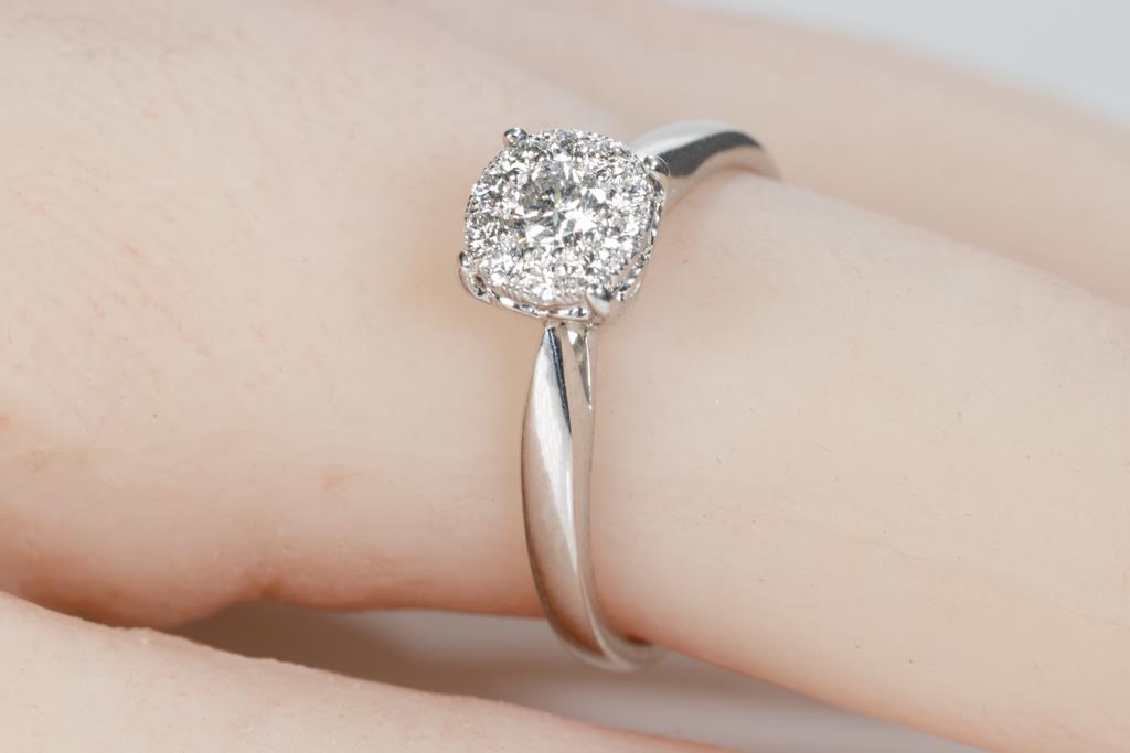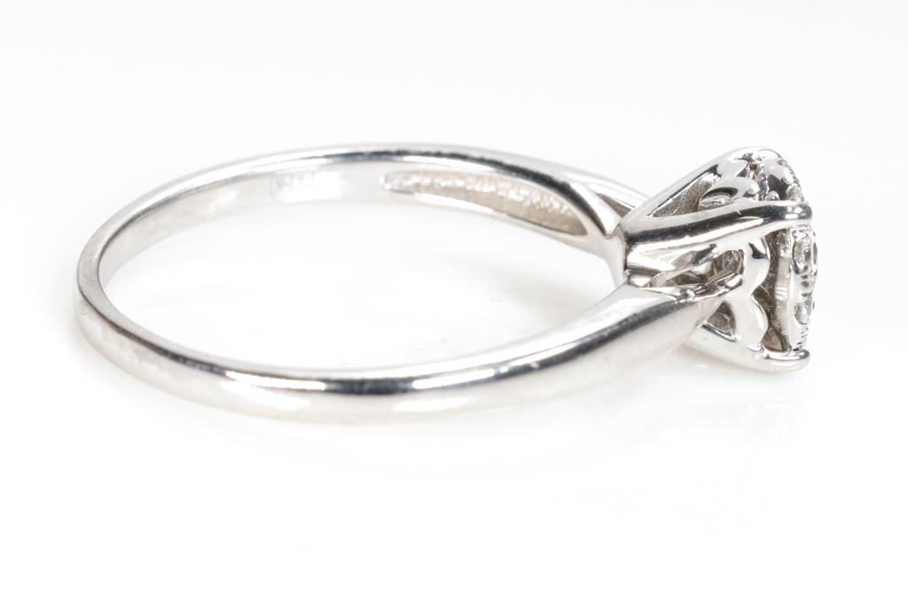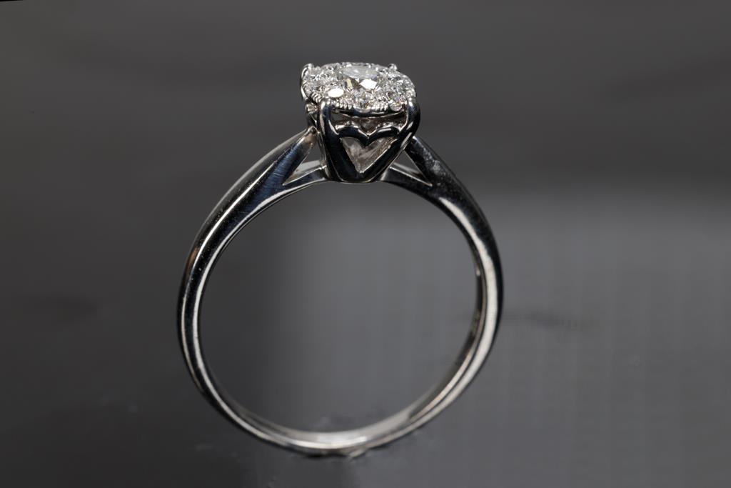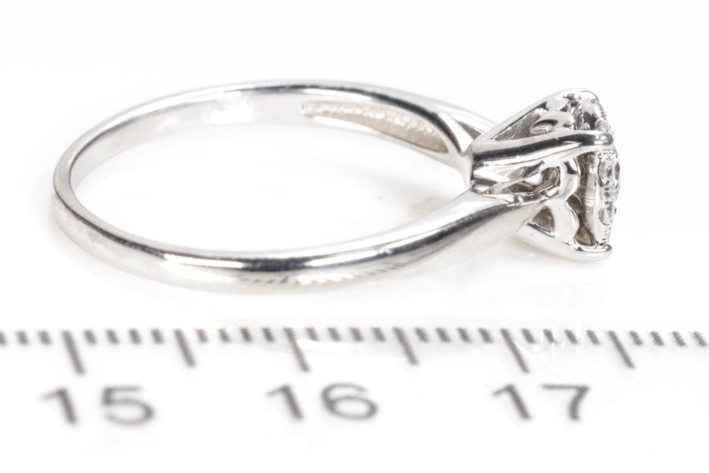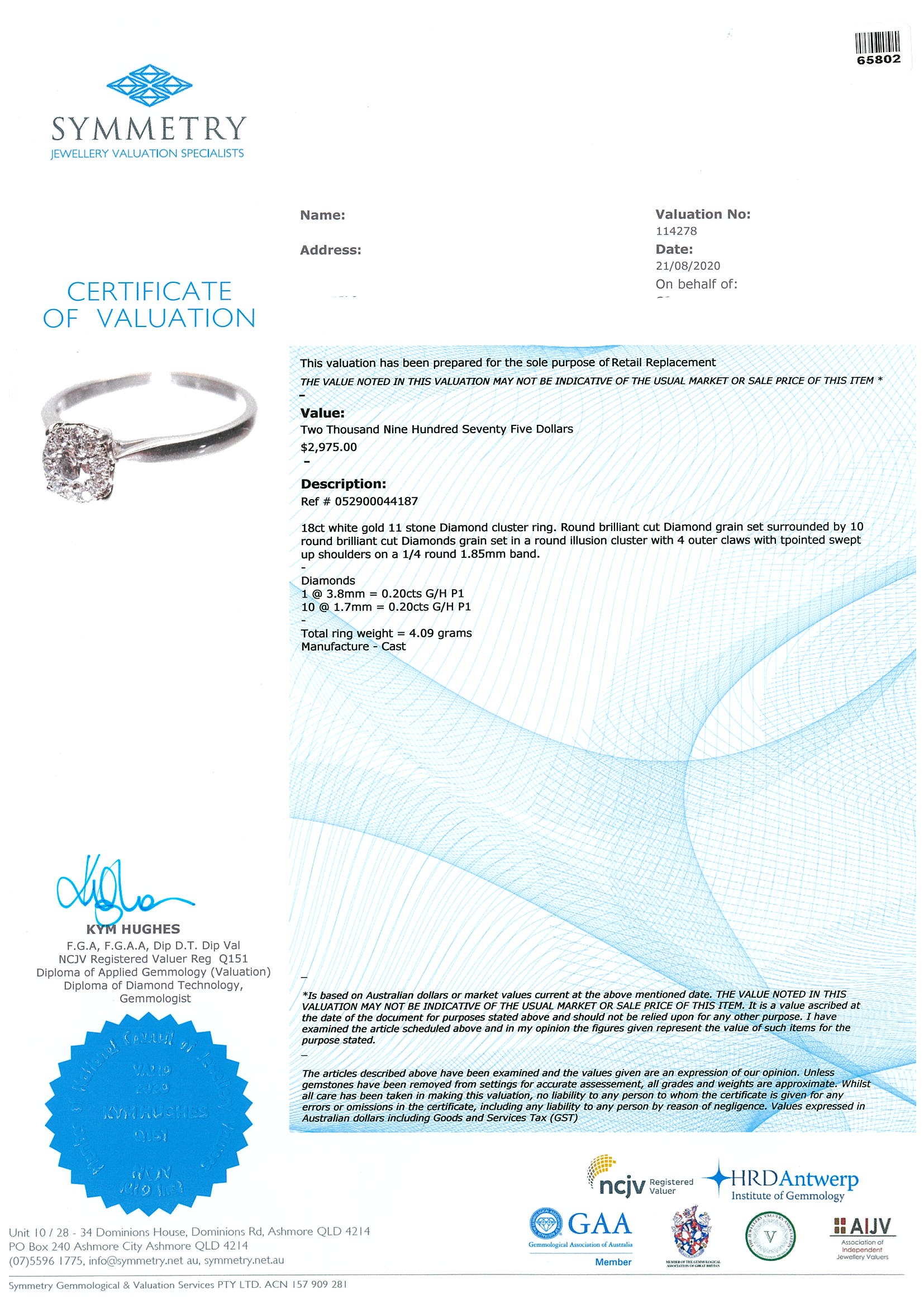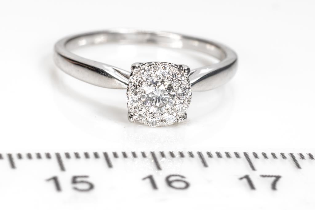 Diamond Halo ring with centre round cut Diamond of 0.20cts and round Diamonds totalling approximately 0.20cts. 18ct white gold. Ring size: P1/2. Weight 4.0g. With valuation #114278. (Pre-owned)