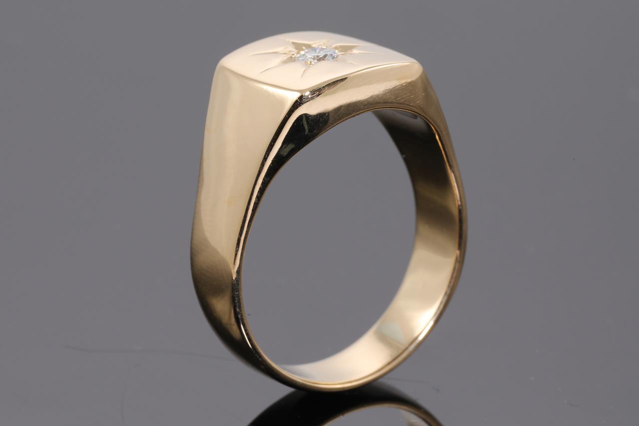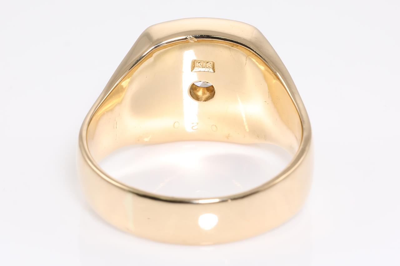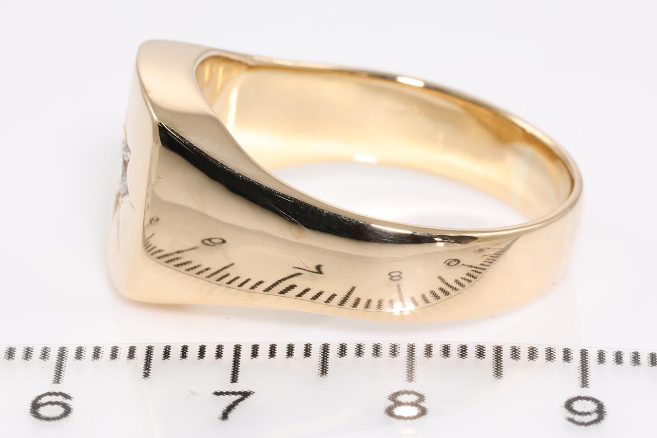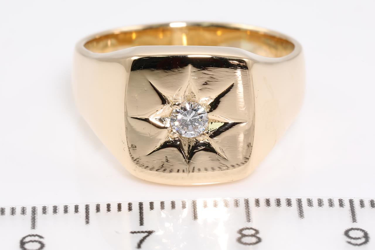 Diamond mens ring with a round Diamond of 0.20ct (Estimated grading: G-H SI1). 18ct yellow gold. Ring size V1/2. Weight: 18.9g (Pre-owned, note scratches as shown in images)