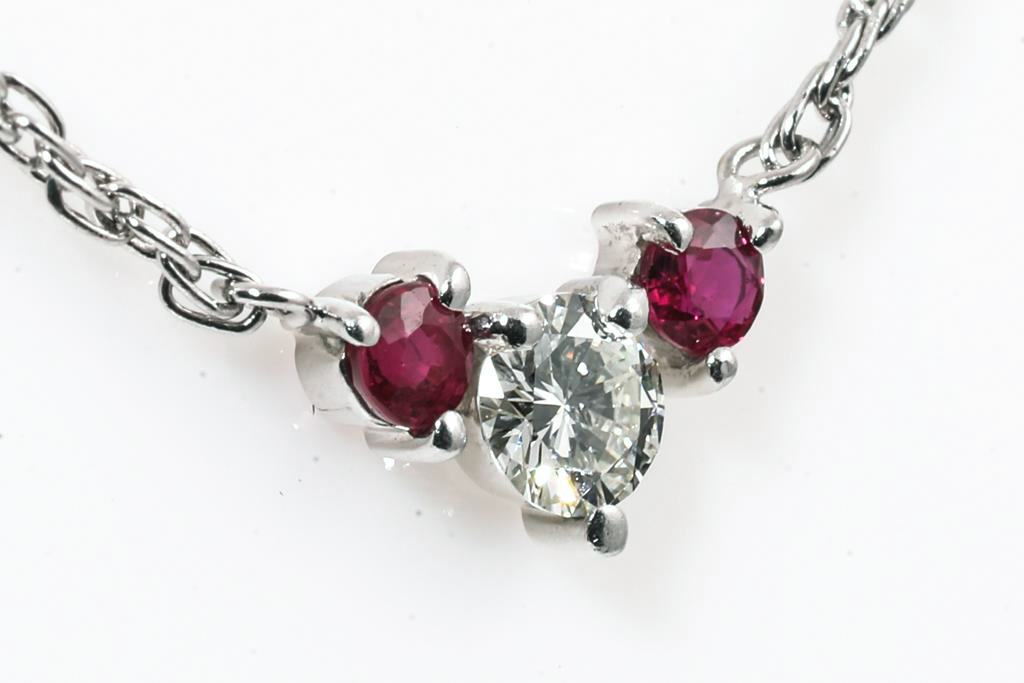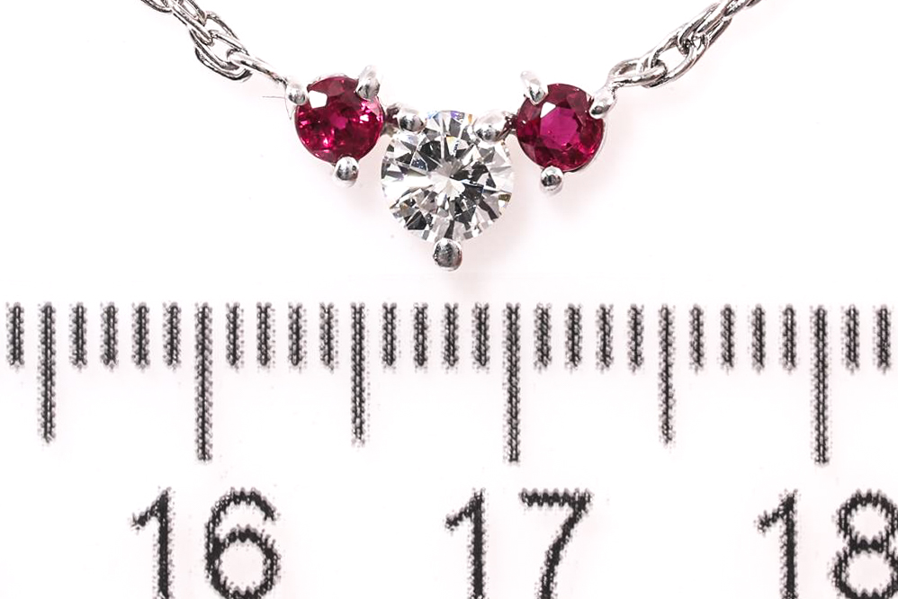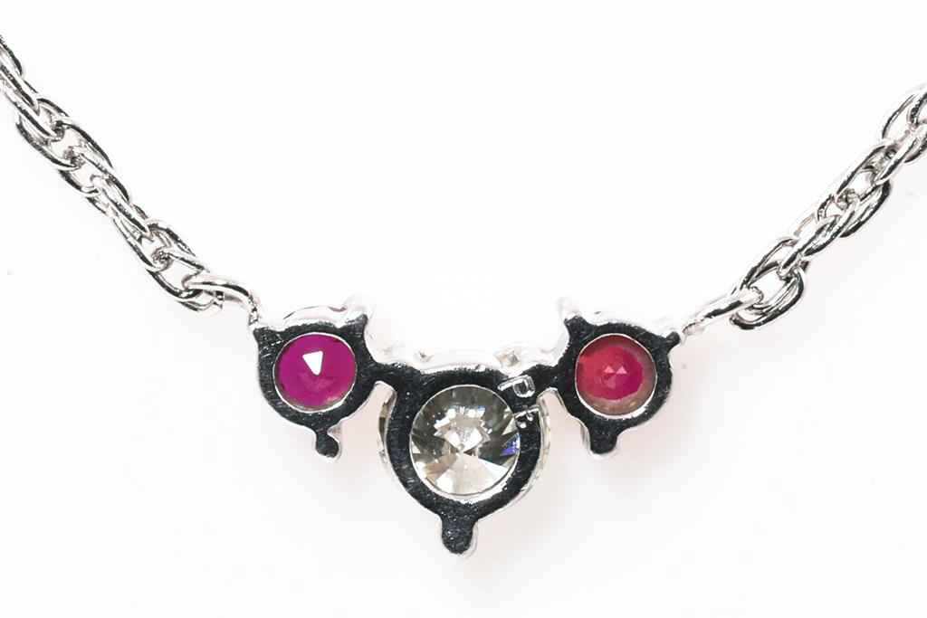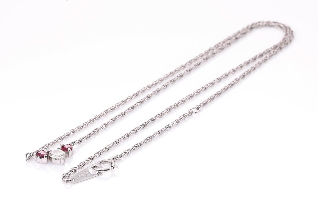Ruby and Diamond pendant with round Rubies totalling approximately 0.20cts and a round Diamond of approximately 0.30ct (Estimated grading: I VS). Platinum with attached chain. Adjustable max length: 43cm Weight: 4.1g (Pre-owned)