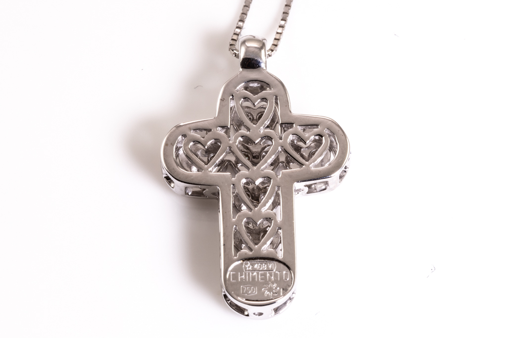 Diamond cross pendant with round Diamonds totalling 0.21cts. 18ct white gold with 44cm 18ct white gold adjustable chain. Weight: 7.3g. (pre-owned)