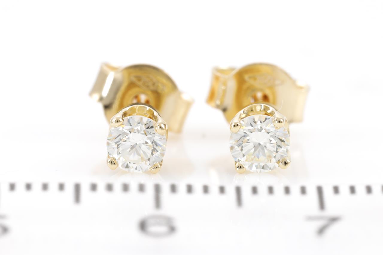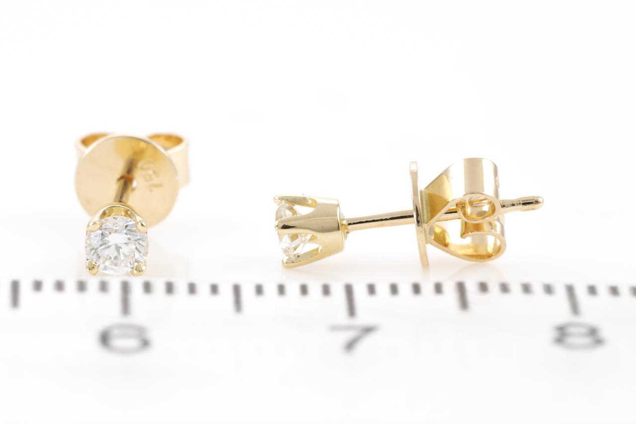 Diamond stud earrings with 2 round Diamonds totalling 0.21cts (Estimated grading: I-J VS). 18ct yellow gold. Weight: 1.0g. (New)