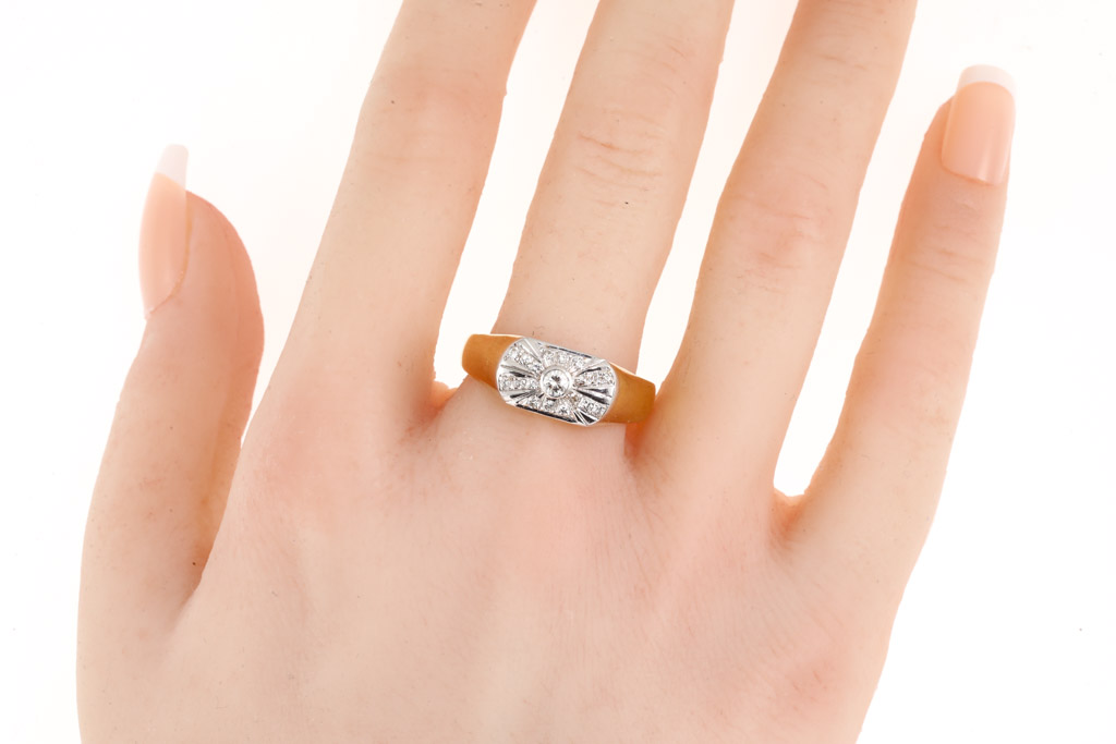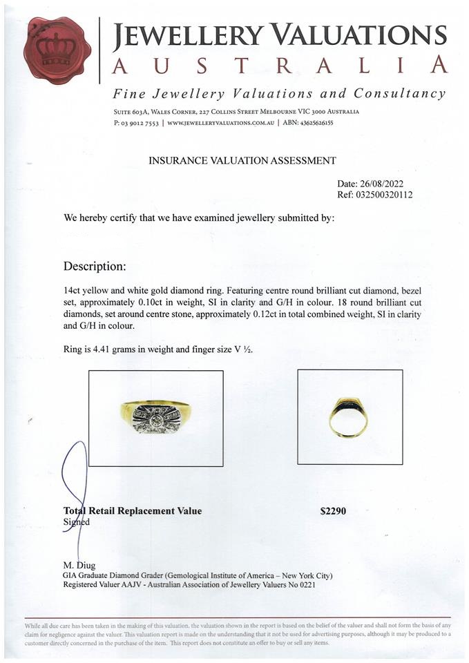 Diamond dress ring with round Diamonds totalling 0.22cts. 14ct yellow and white gold. Ring size V1/2. Weight: 4.4g. With Valuation Certificate Ref #032500320112. (Pre-owned)
