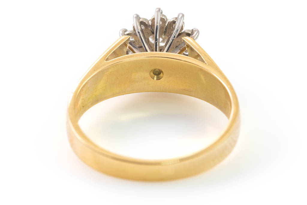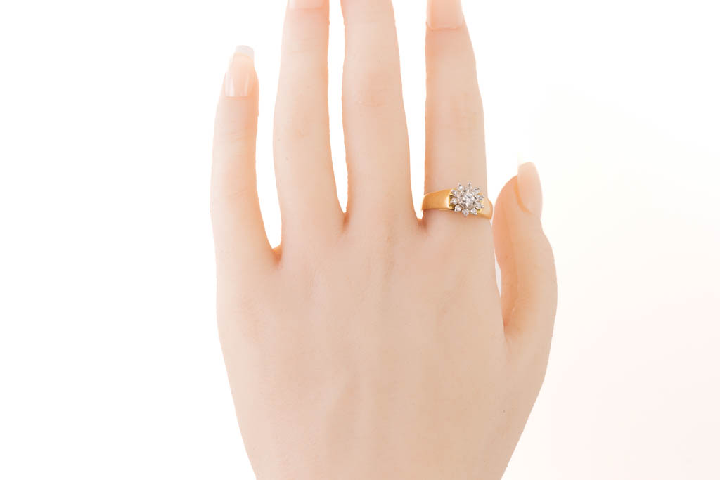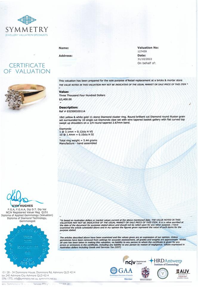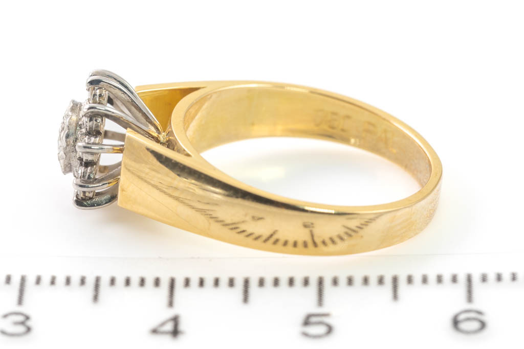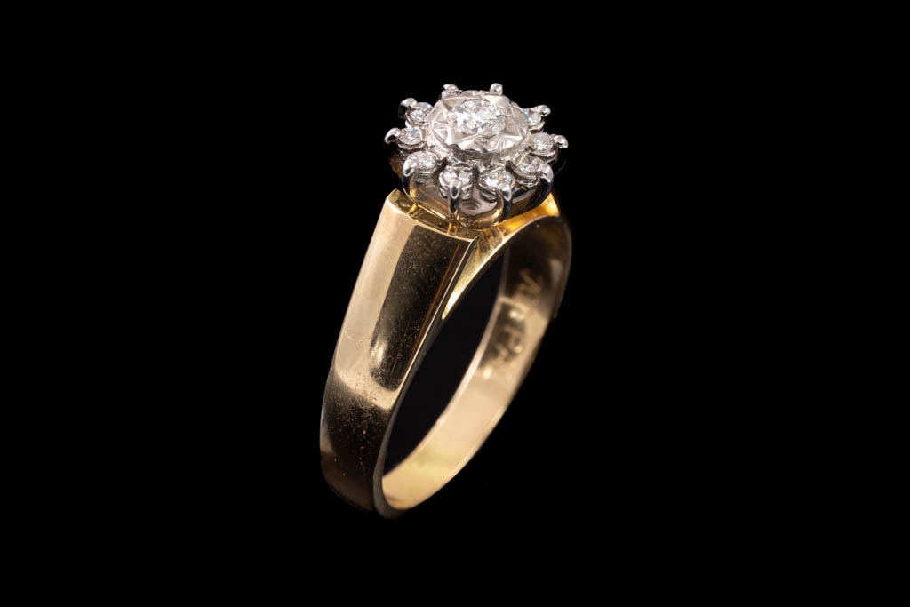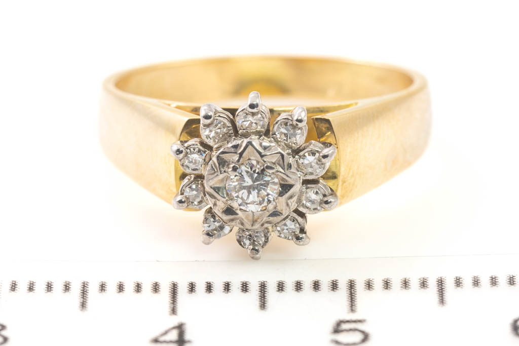 Diamond dress ring with 11 round Diamonds totalling 0.22ct. 18ct yellow and white gold. Ring size N 1/2. Weight: 5.4g. With Valuation Certificate #032500320114.