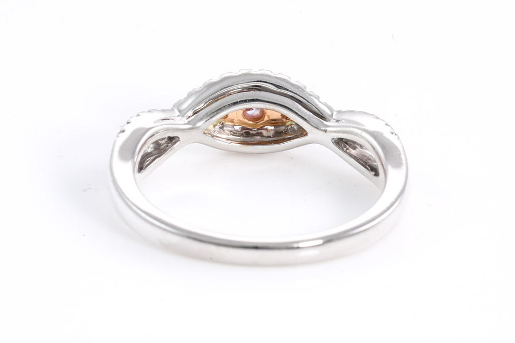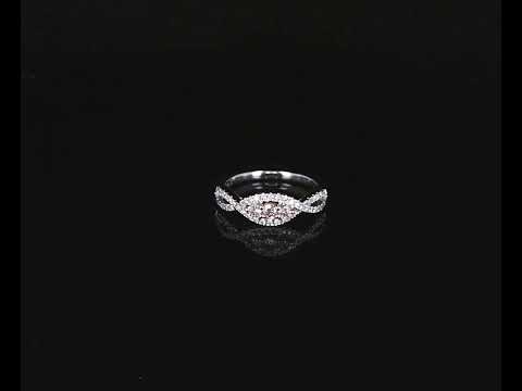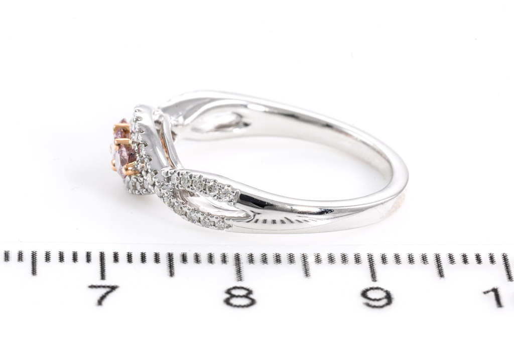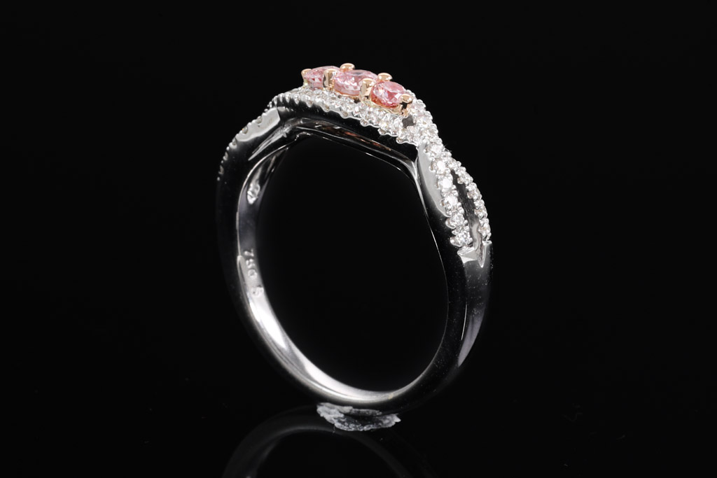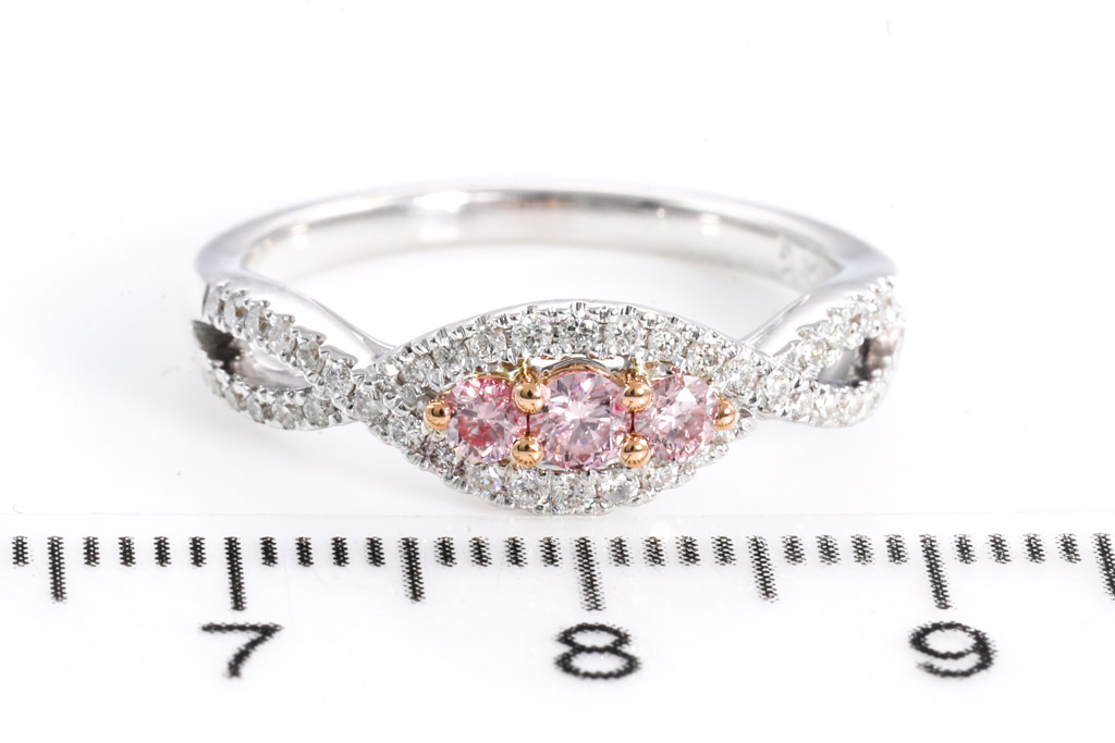 Diamond ring with 3 round pink Argyle Diamonds; centre diamond of 0.10ct and 2 side pink diamonds totalling 0.12cts (Estimated grading: 6PR SI) and white round Diamonds totalling approximately 0.23cts (Estimated grading: G SI). 18ct white and rose gold. Ring size M1/2. Weight: 4.7g. With Pink Diamond Certificate of Origin card. (Pre-owned)
