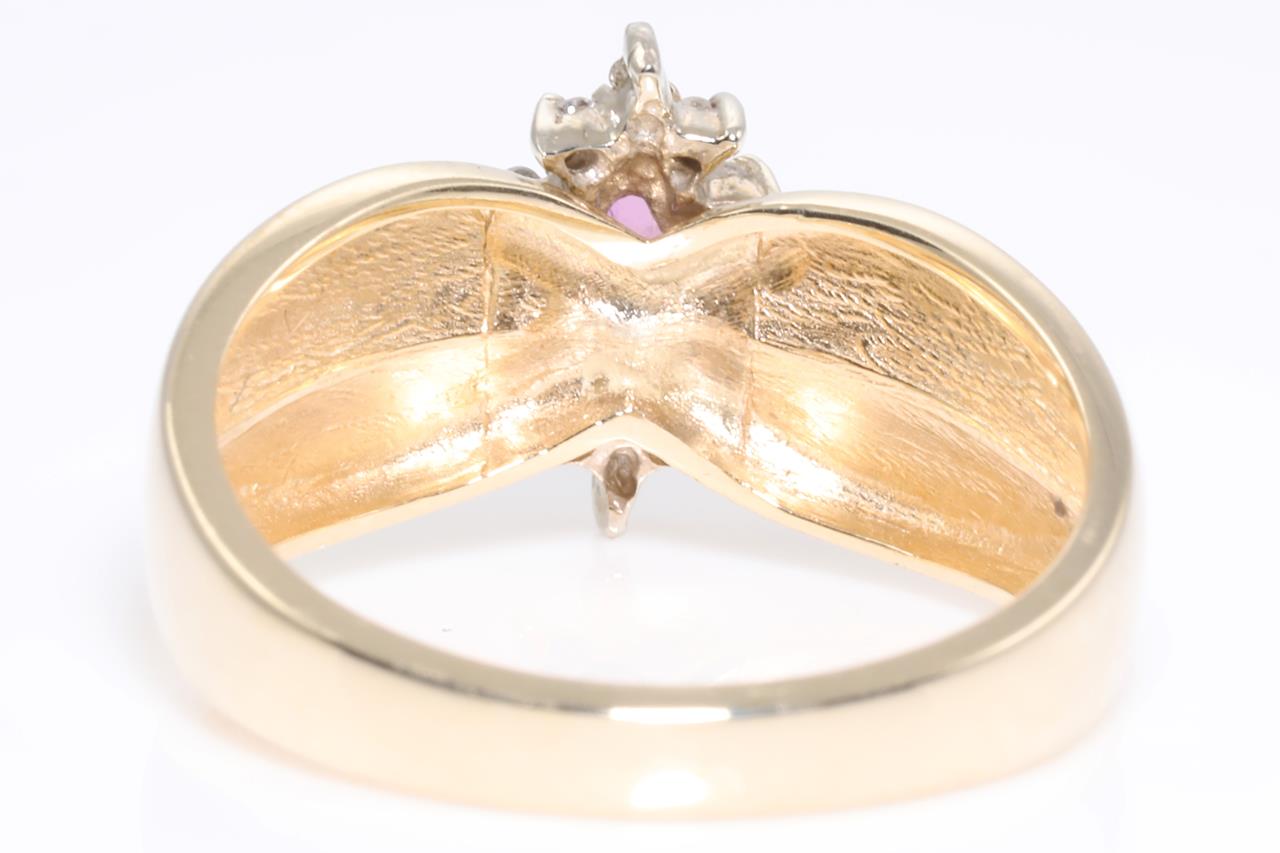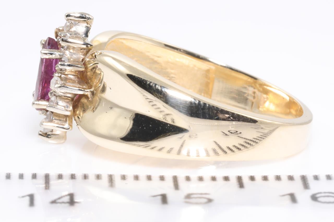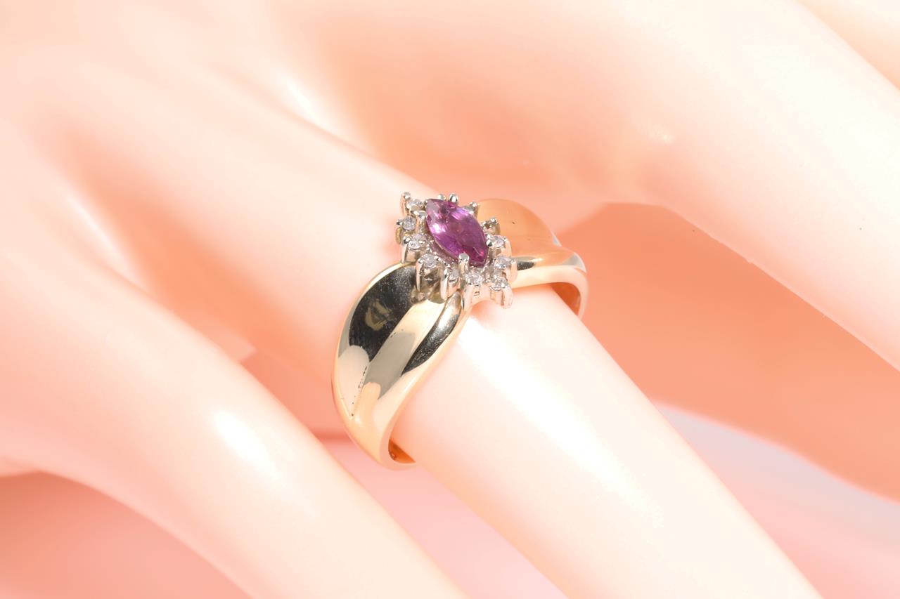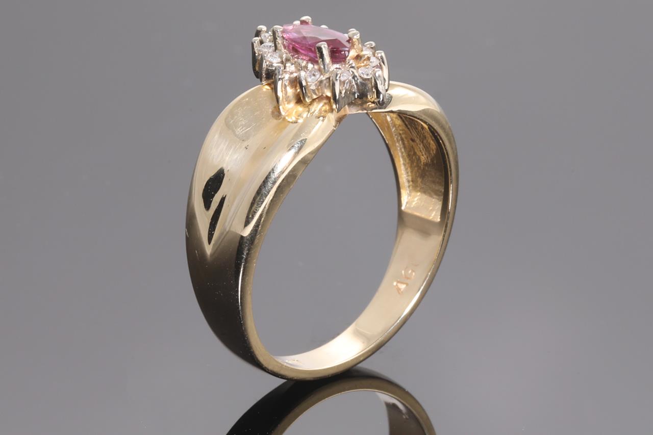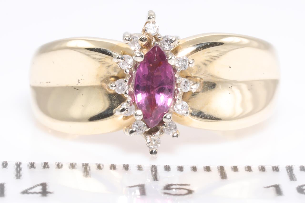 Ruby and Diamond Ring with marquise cut Ruby of approximately 0.23ct and round Diamonds totalling approximately 0.10ct. 14ct yellow gold. Ring size L. Weight 3.5g. (pre-owned)