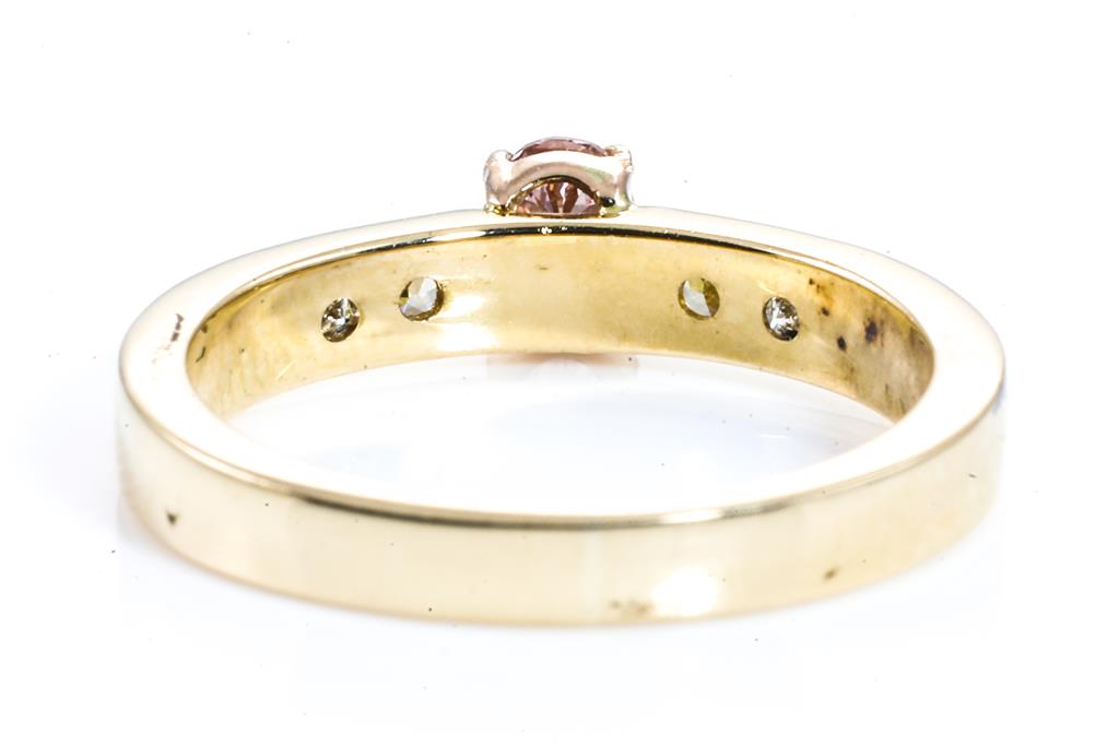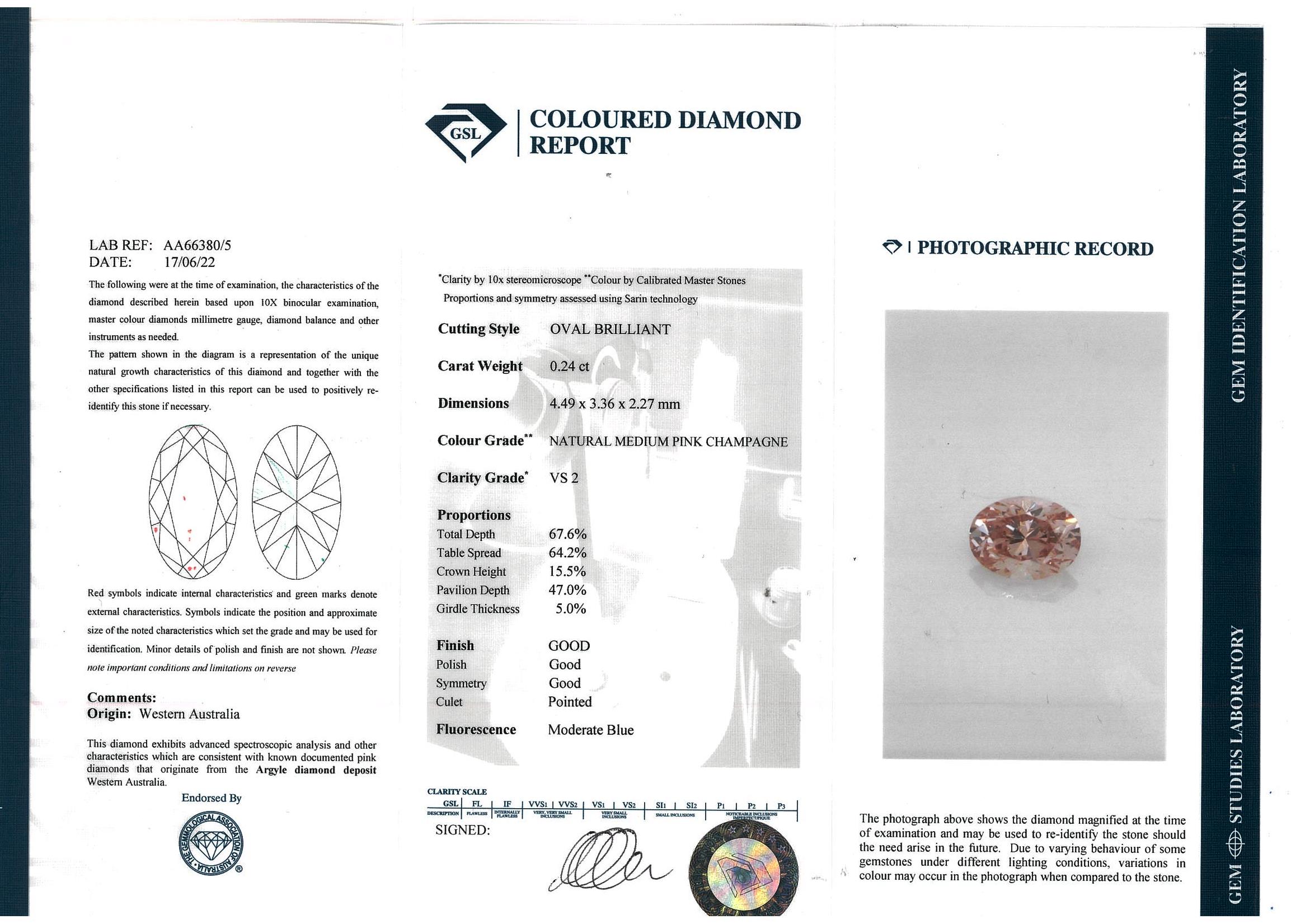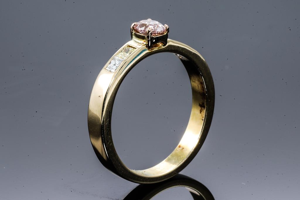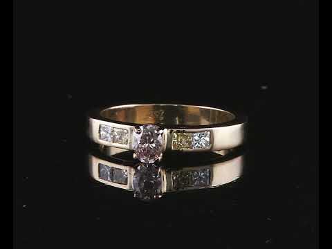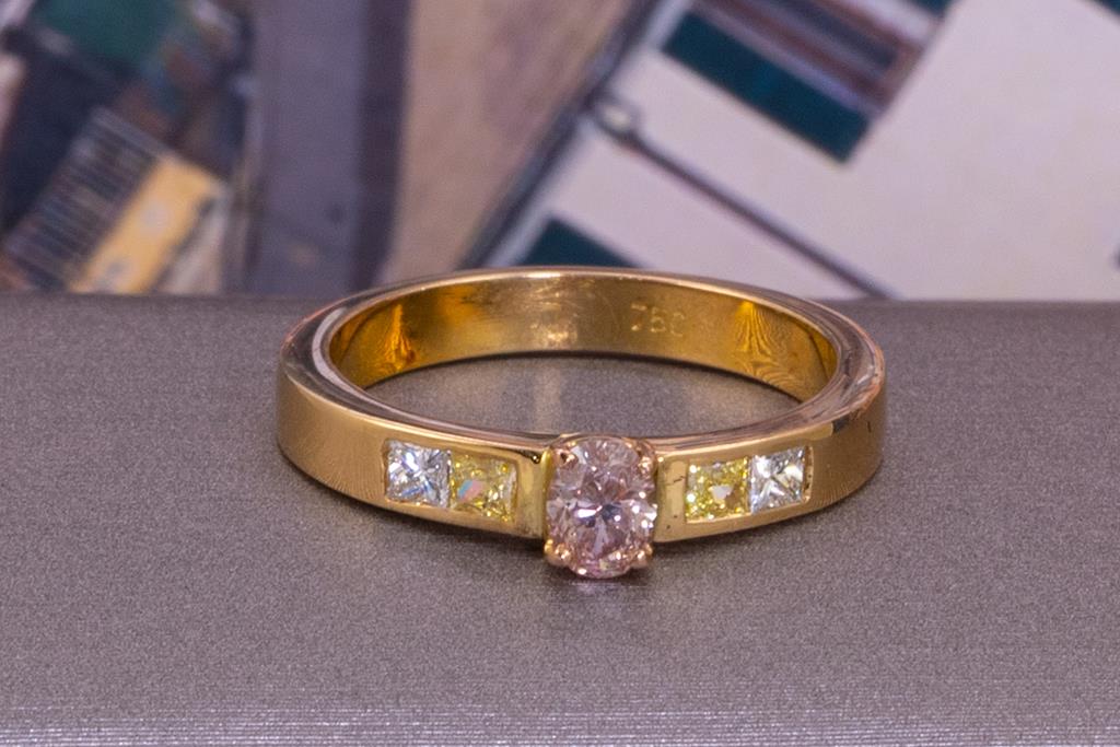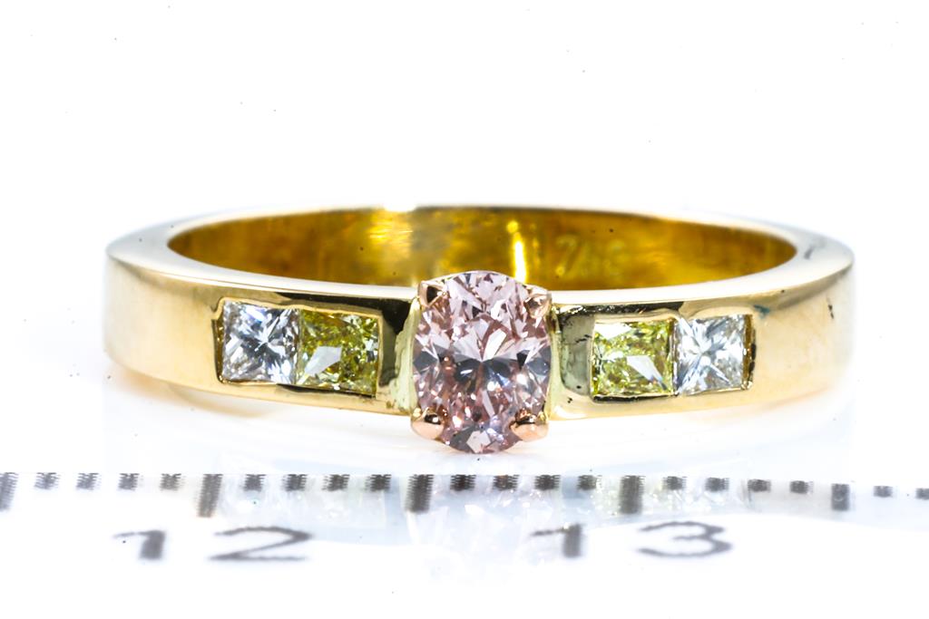 Diamond ring with centre oval shape Argyle Diamond of 0.24ct (with GSL report grading it as Natural Medium Pink Champagne VS2 #AA66380/5) with princess cut yellow Diamonds of approximately 0.10cts and white Diamonds of approximately 0.10cts. 18ct yellow gold. Ring size I 1/2. Weight 3.2g. (Pre-owned)
