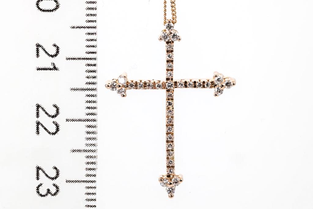 Diamond cross pendant with round Diamonds totalling 0.25cts. 18ct rose gold with 42cm chain. Weight: 3.9g. (Pre-owned)