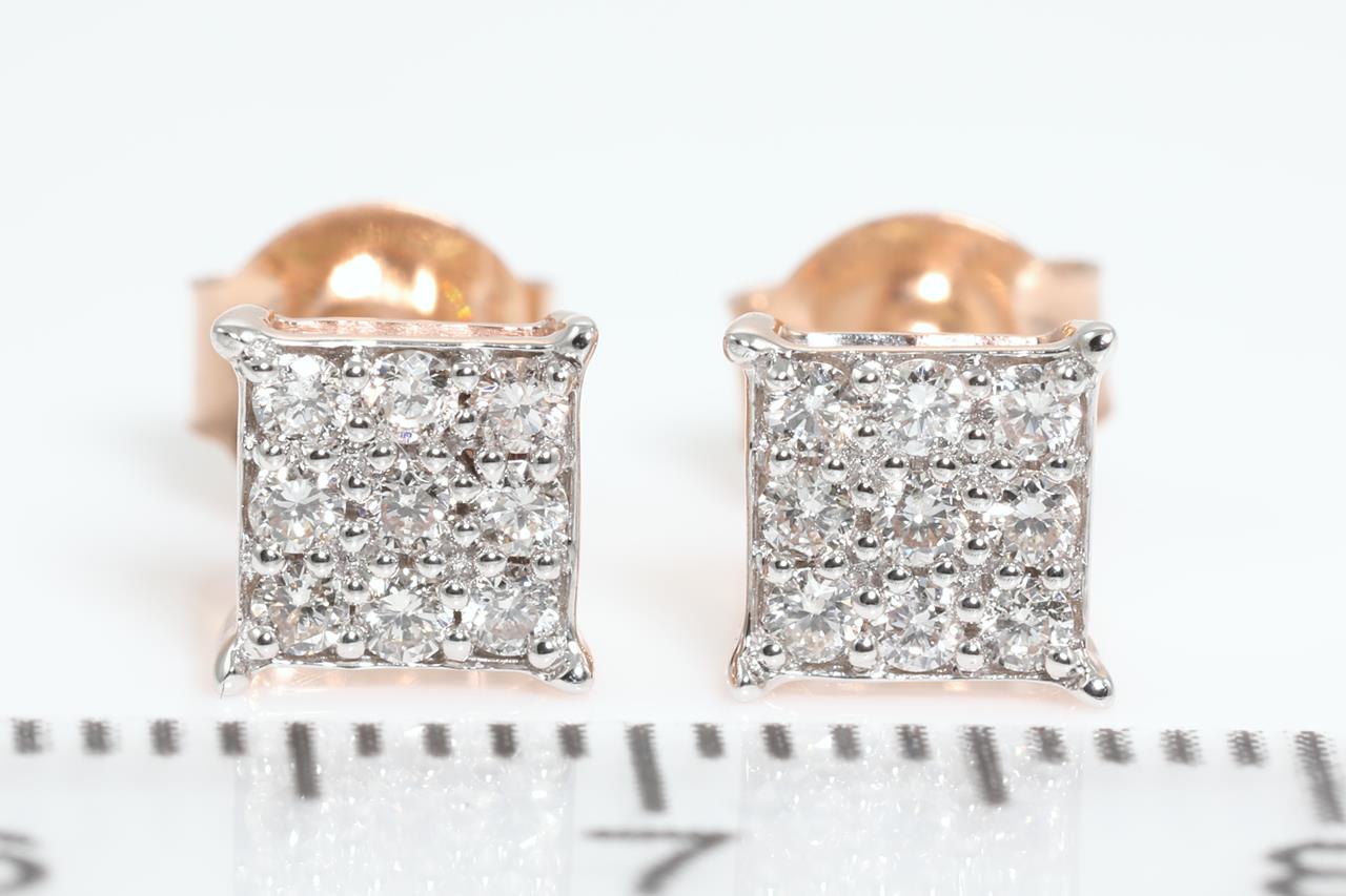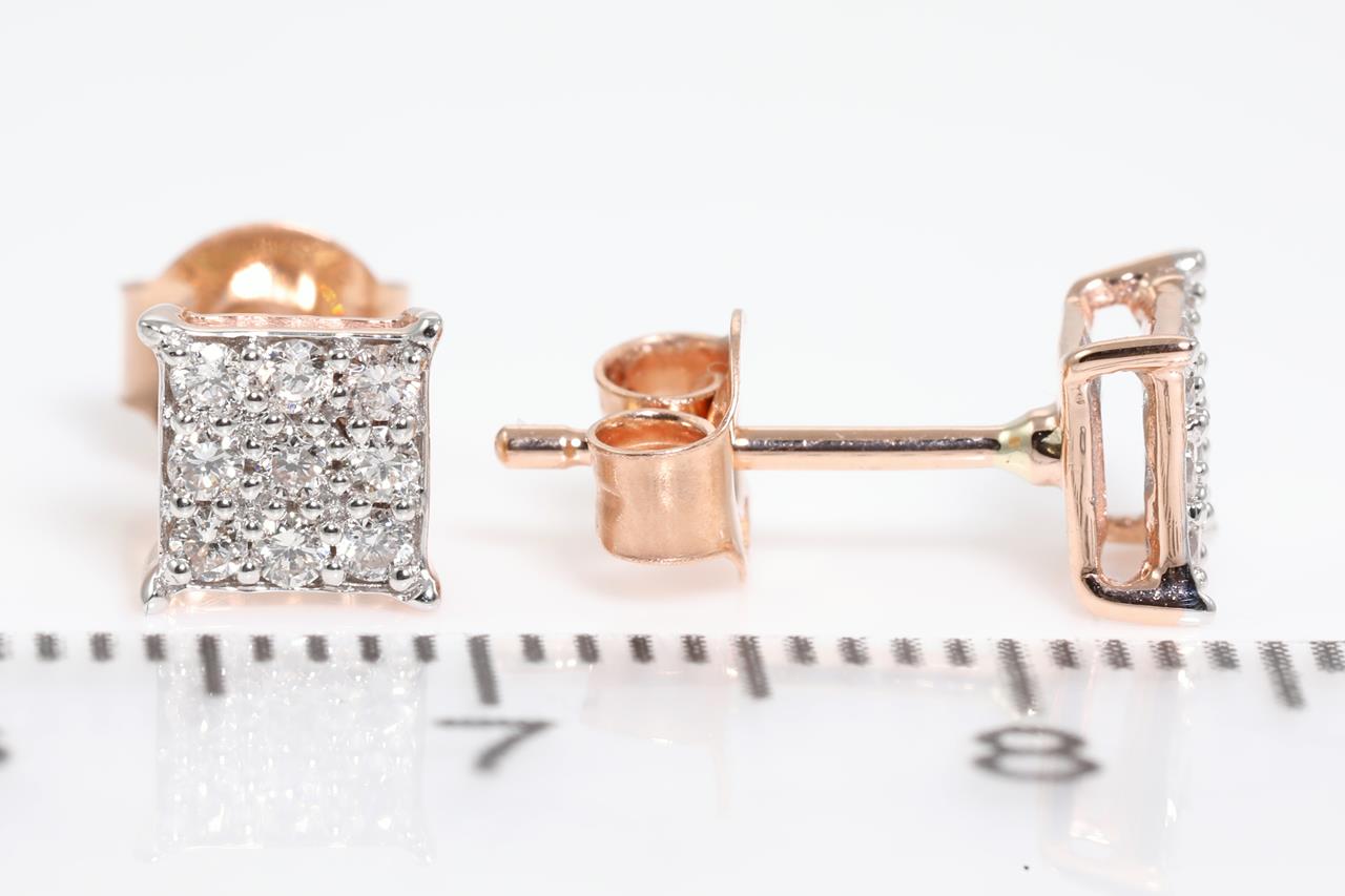 Diamond stud earrings with 18 round Diamonds totalling 0.25cts (Estimated grading: H SI). 14ct rose gold and white gold. Weight: 1.3g (New)