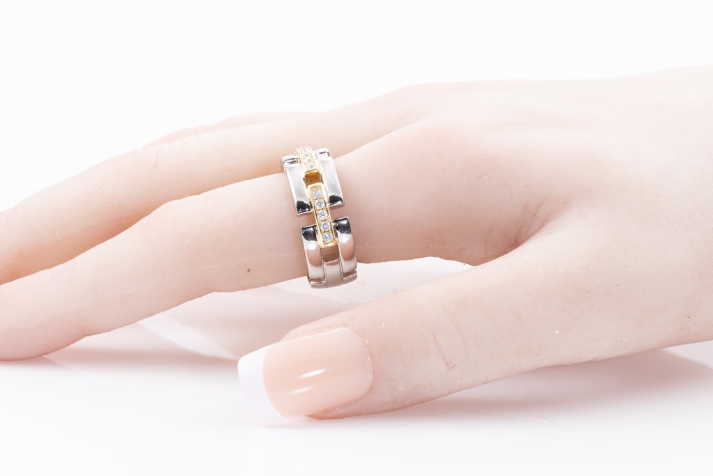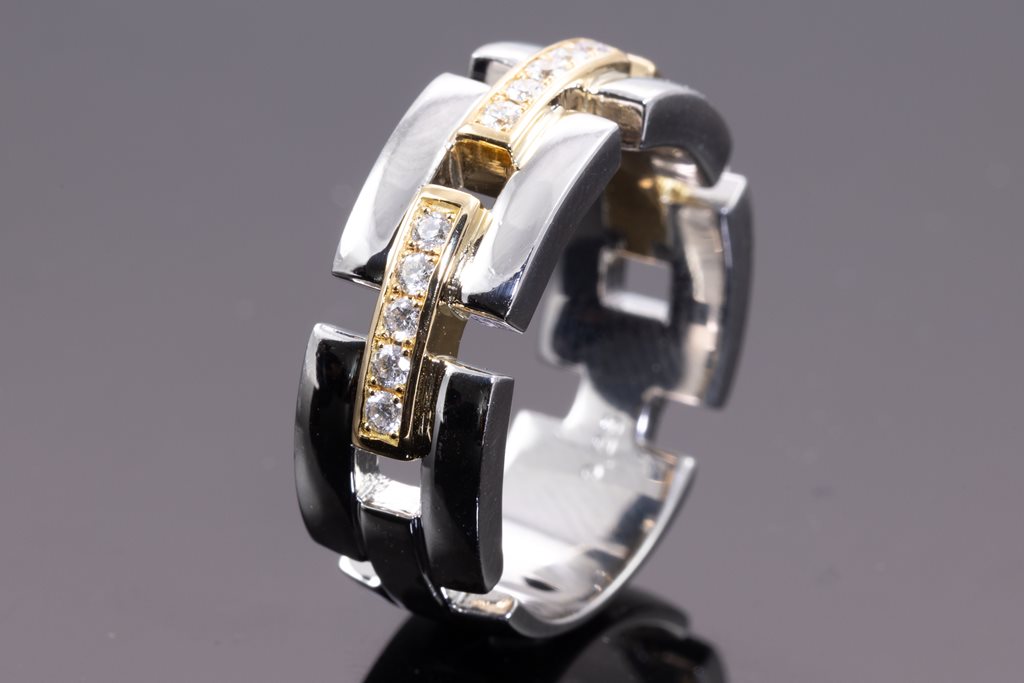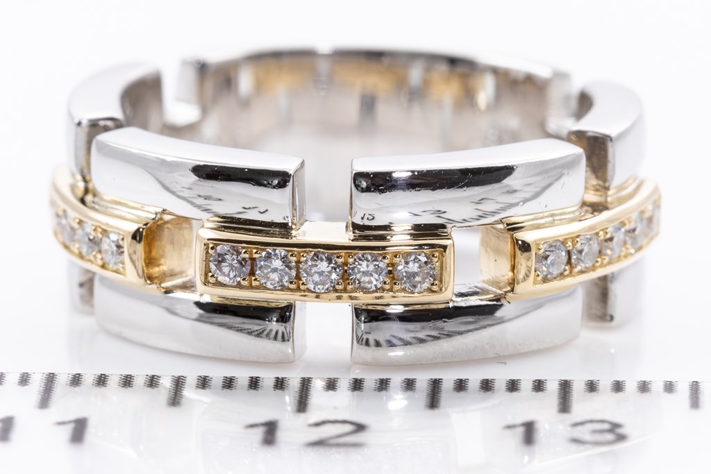 Diamond mens ring with round Diamonds totalling 0.25cts (Estimated grading: G-H SI). 18ct yellow gold and platinum. Ring size: Q1/2 - ring resizing is not recommended. Weight: 17.6g. (Pre-owned)