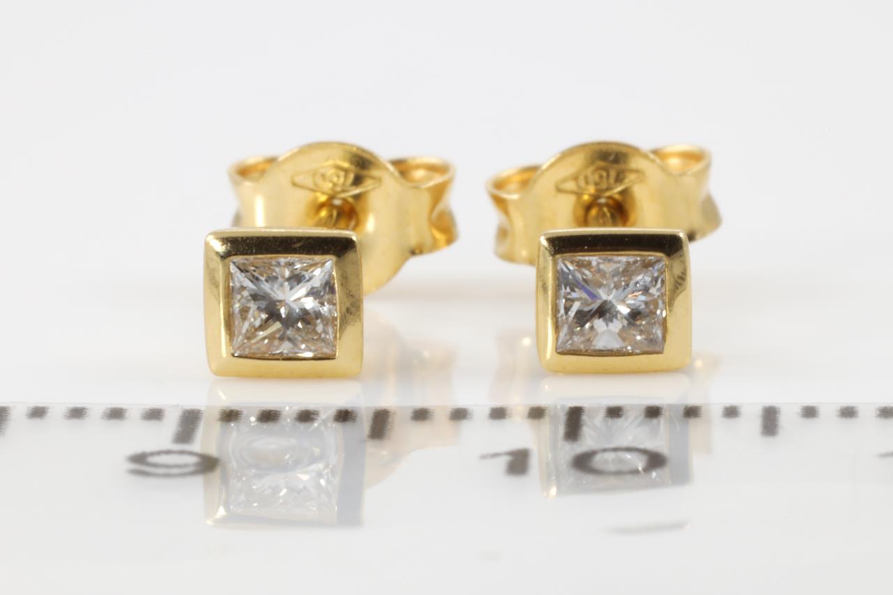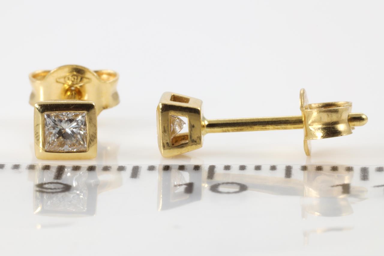 Diamond stud earrings with princess cut Diamonds totalling 0.25cts (Estimated grading: G-H VS-SI). 18ct yellow gold. Weight: 1.2g. (As New)