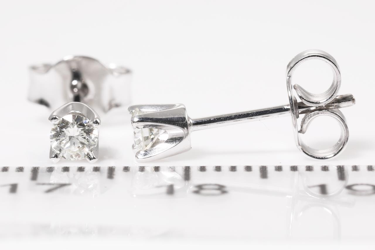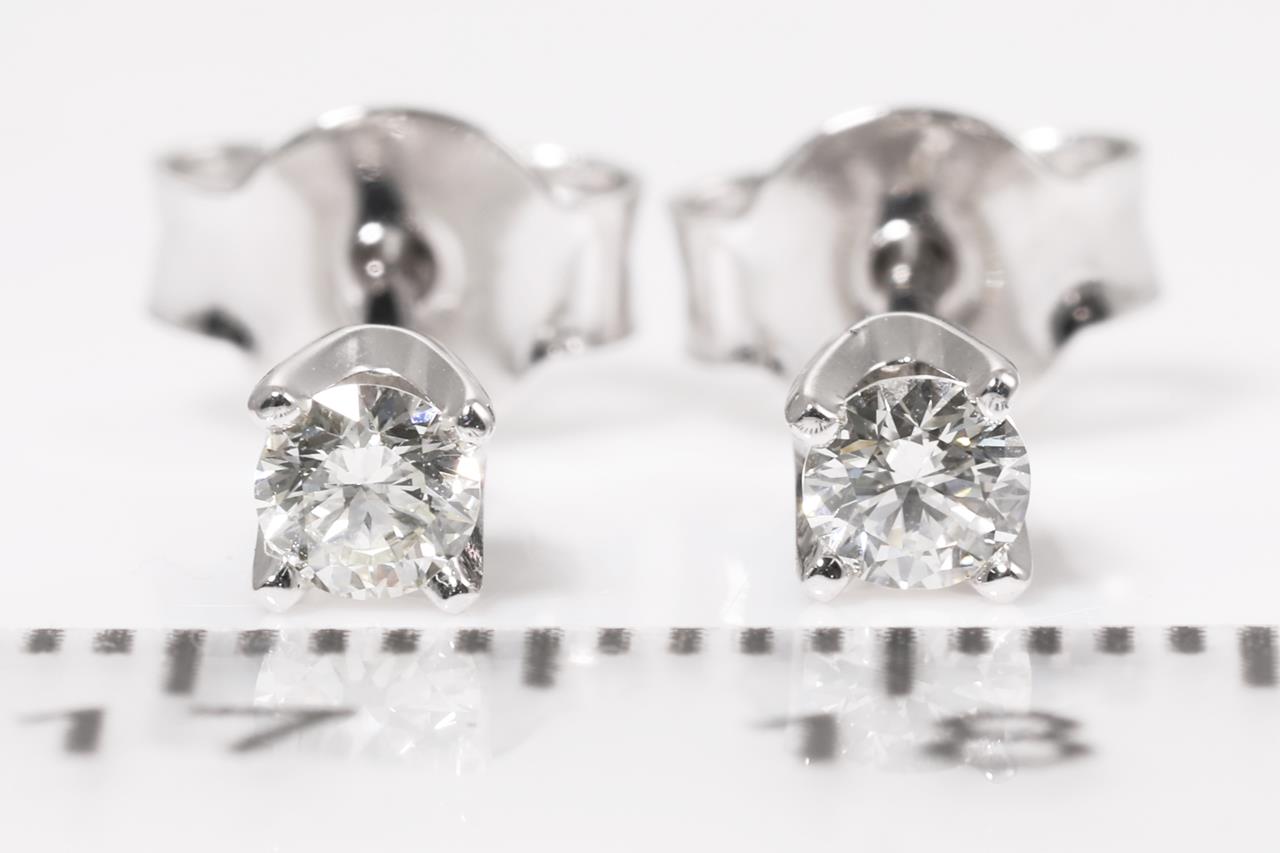Diamond stud earrings with 2 round Diamonds totalling 0.25cts (Estimated grading: H-I SI). 18ct white gold. Weight: 1.2g. (New)
