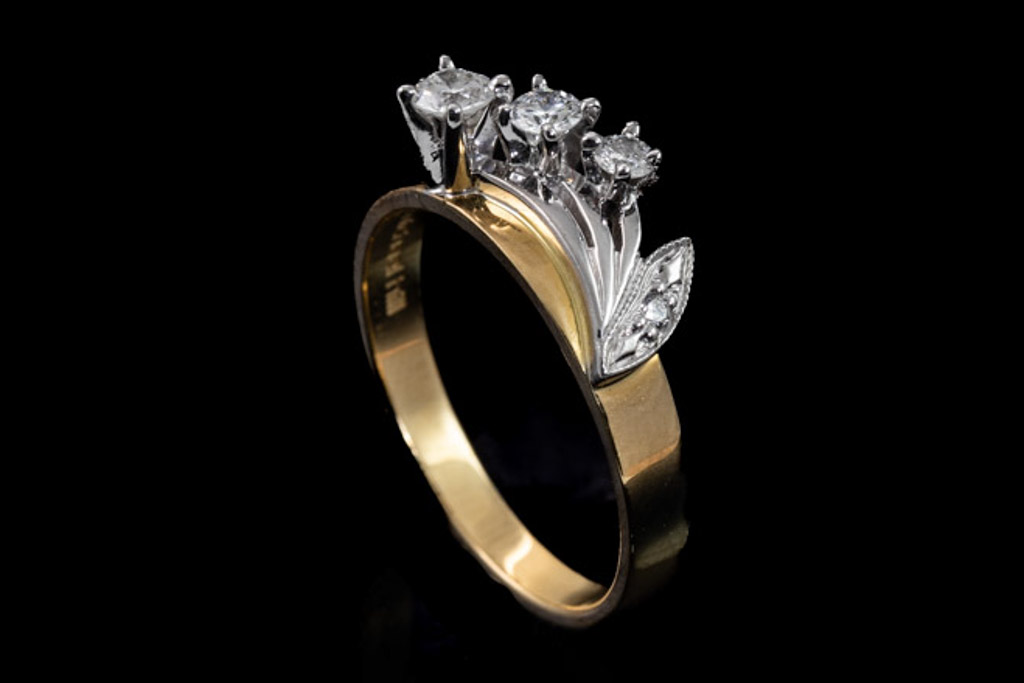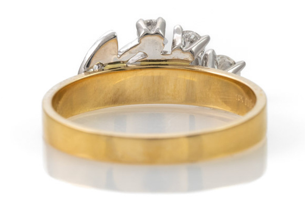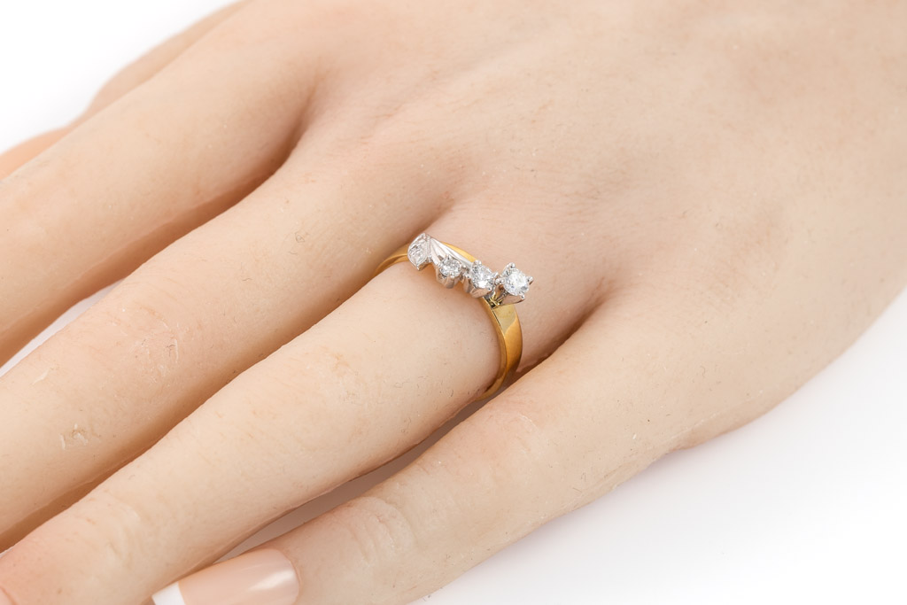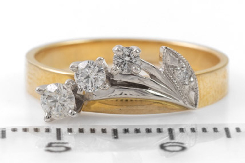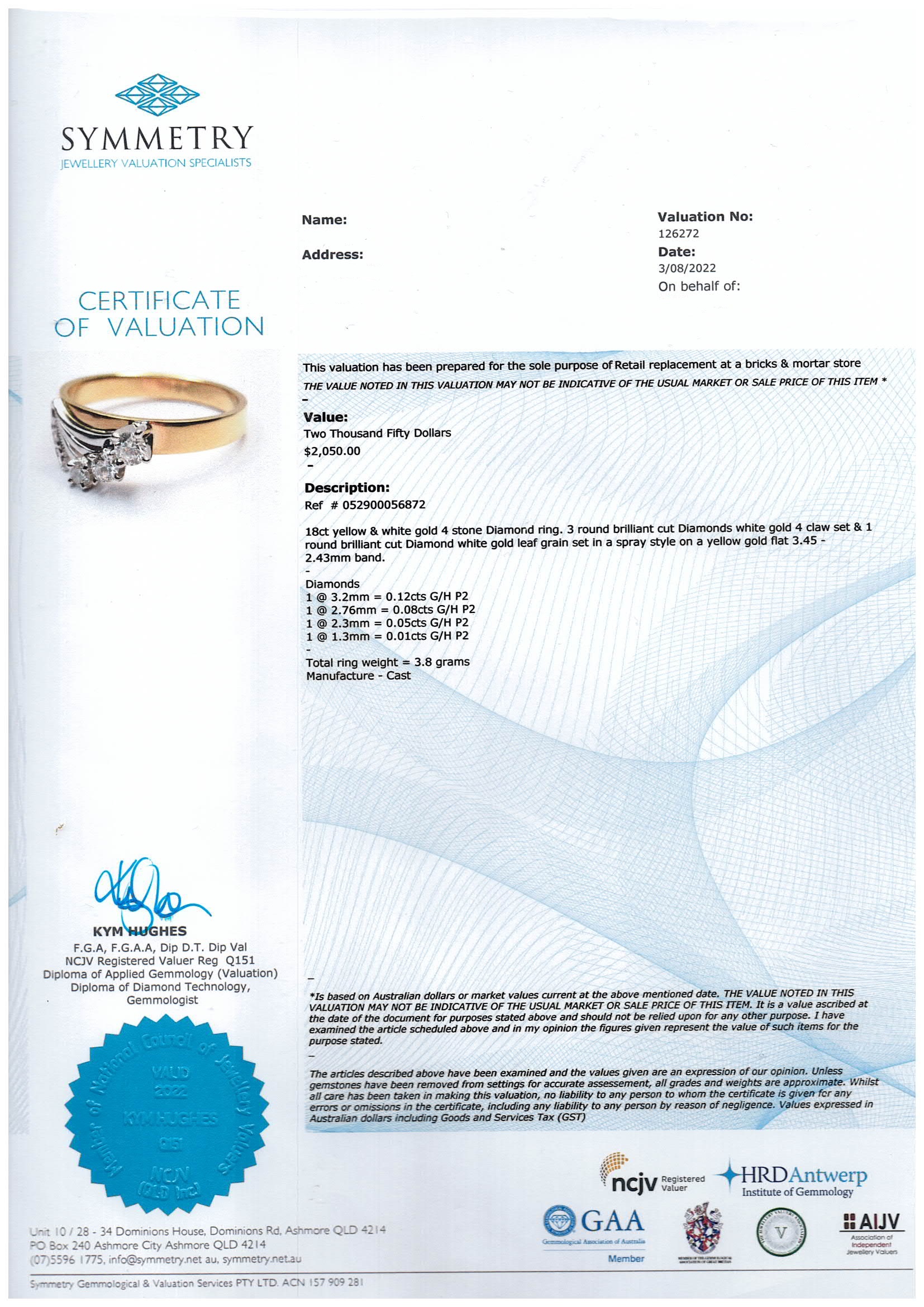 Diamond dress ring with 4 round Diamonds totalling 0.26cts. 18ct yellow and white gold. Ring size M1/2. Weight: 3.8g. Engrave Michael Hill. With Valuation Certificate Ref# 052900056872. (Pre-owned)