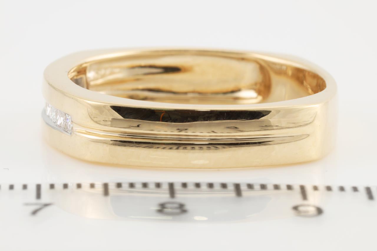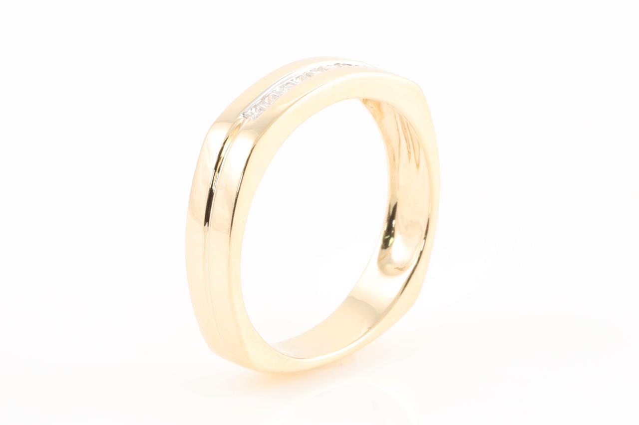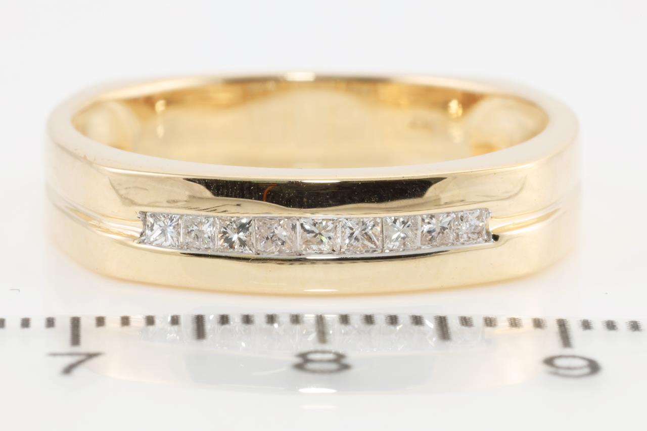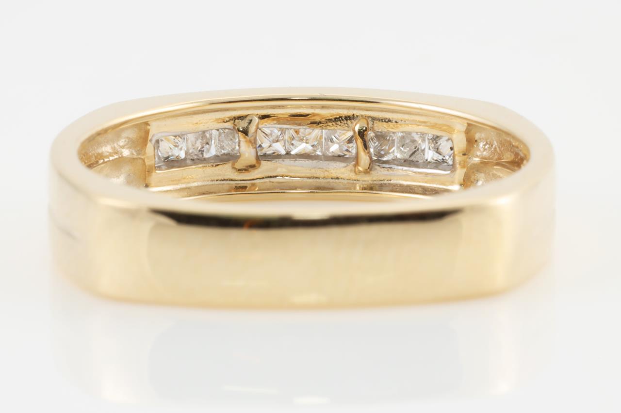 Diamond Mens ring with princess cut Diamonds totalling 0.26cts (Estimated grading: G-H SI-P1). 9ct yellow gold. Ring size V - ring resizing is not recommended. Weight: 5g (New)