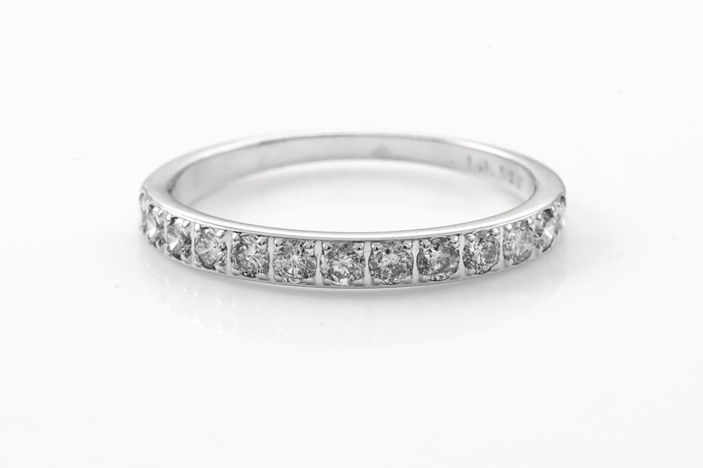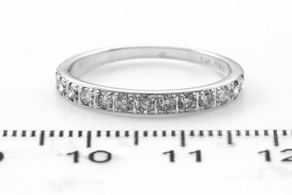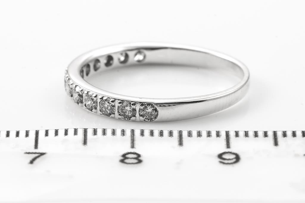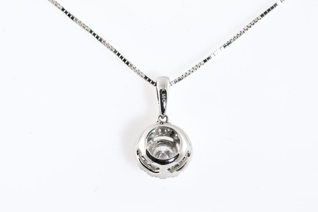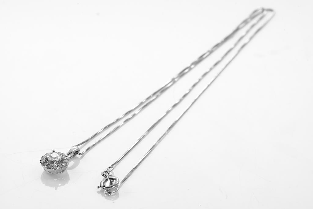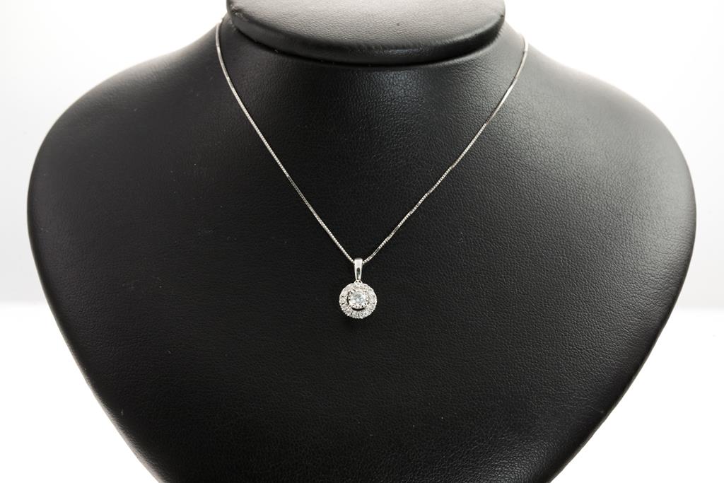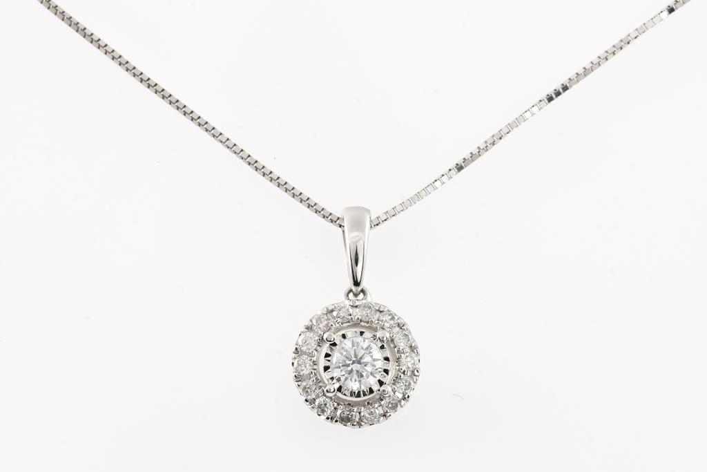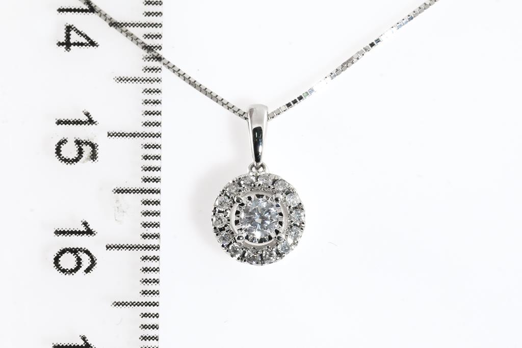 Diamond Halo Pendant with centre round brilliant cut Diamond of approximately 0.29ct and round Diamond totalling approximately 0.14cts. 10ct white gold. Signed Michael Hill Jewellery. With 18ct white gold 45cm adjustable chain 45cm, Weight 1.6g. Together with a Diamond Wedding Ring with round cut Diamonds totalling approximately 0.40cts (Estimated grading H-J P1-P3) 14ct white gold. Ring size N 1/2. Weight 1.8g. Total weight 3.4g. (Pre-owned)