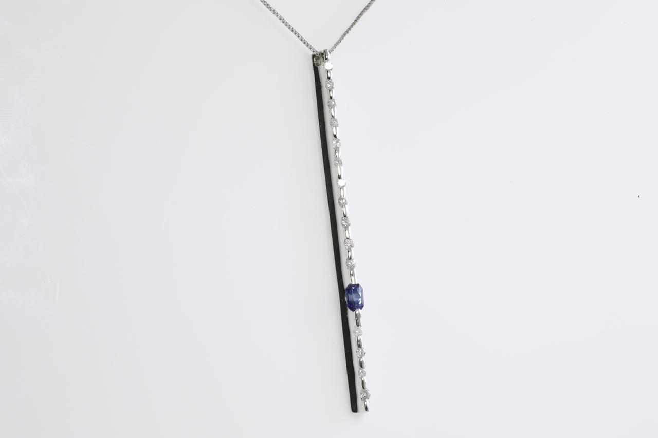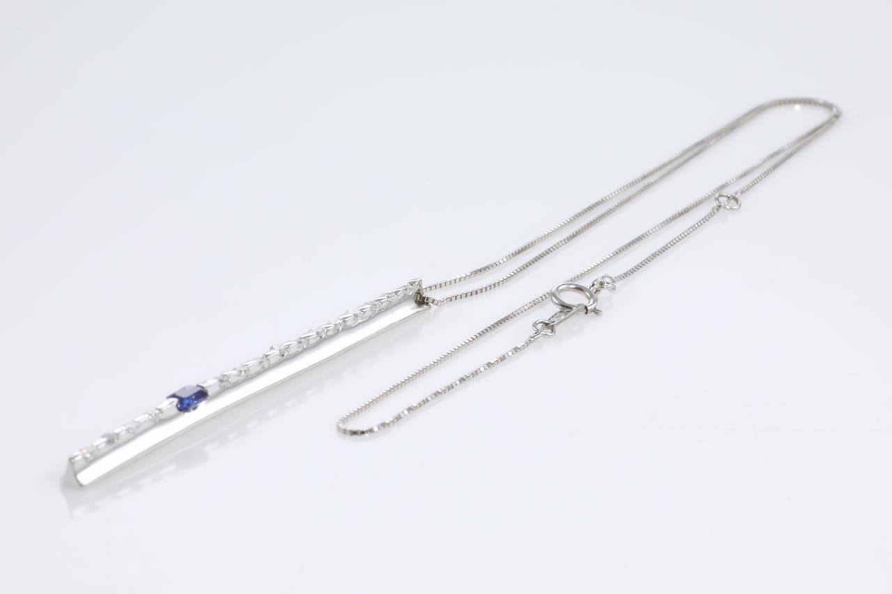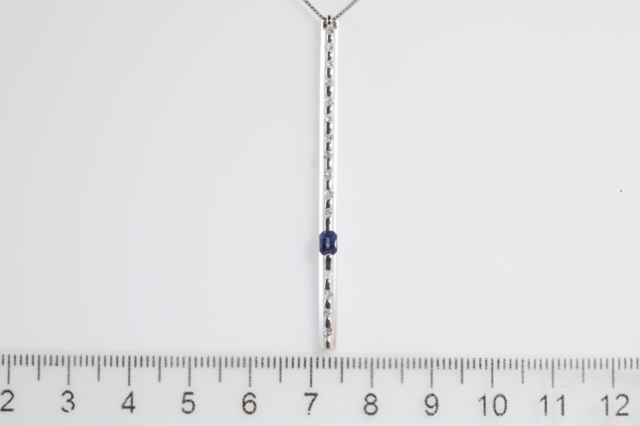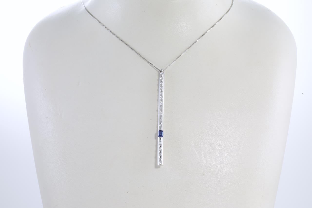 Sapphire and Diamond drop bar pendant with emerald cut Sapphire of 0.26ct and round Diamonds totalling 0.30cts (Estimated grading: H P1-2). 18ct white gold with 18ct gold 40cm adjustable chain. Weight: 5.0g (Pre-owned)