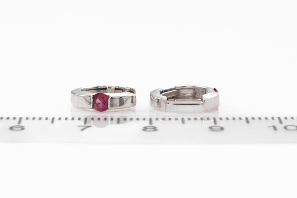 Ruby huggie earrings with round Rubies totalling 0.26cts. 18ct white gold. Weight: 2.0g. (Pre-owned)