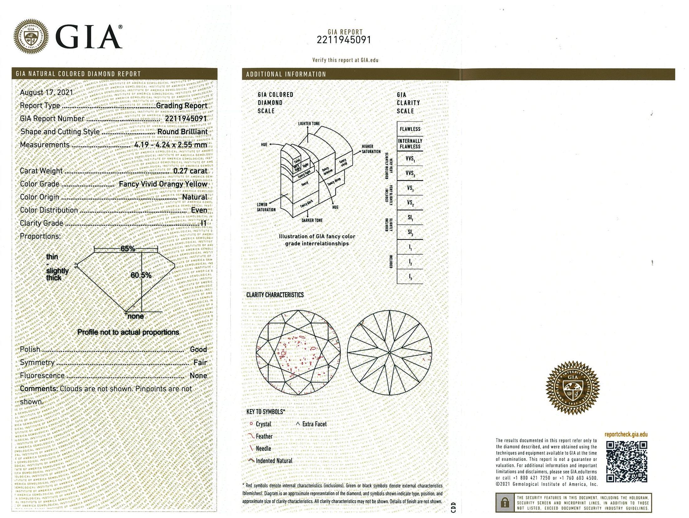 A loose Round brilliant cut Diamond of 0.27ct (With GIA report graded as Natural Fancy Vivid Orangy Yellow P1 #2211945091). (New)