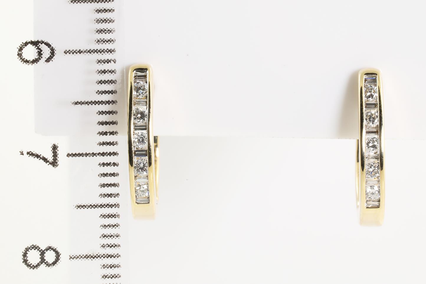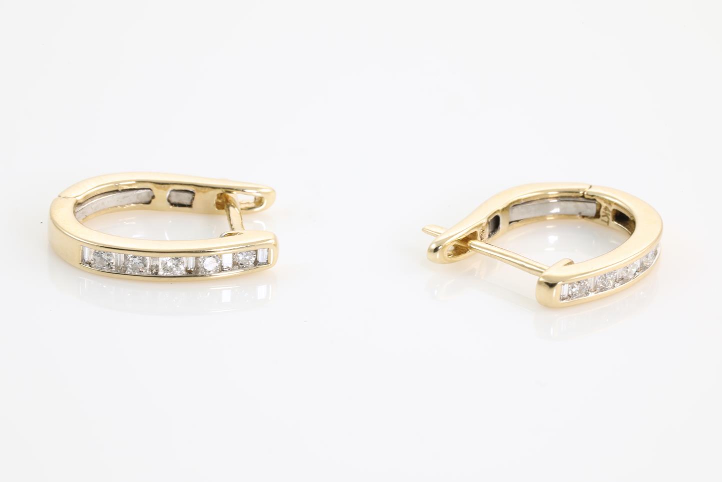 Diamond earrings with round Diamonds totalling 0.18cts and baguette cut Diamonds totalling 0.10cts. 14ct yellow gold. Weight: 3.2g (New)
