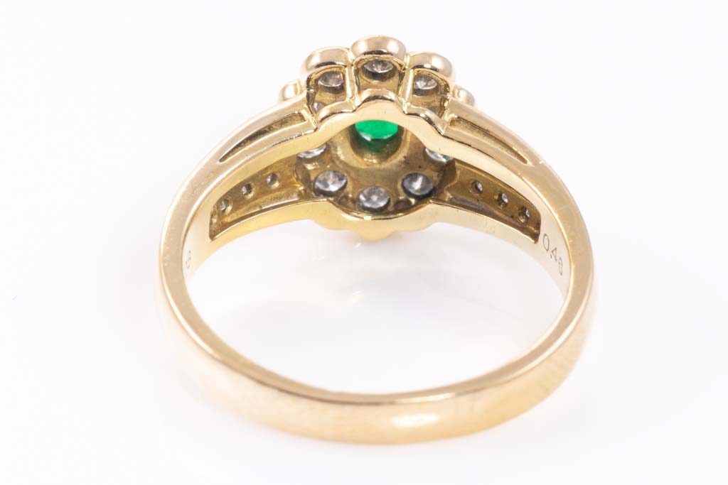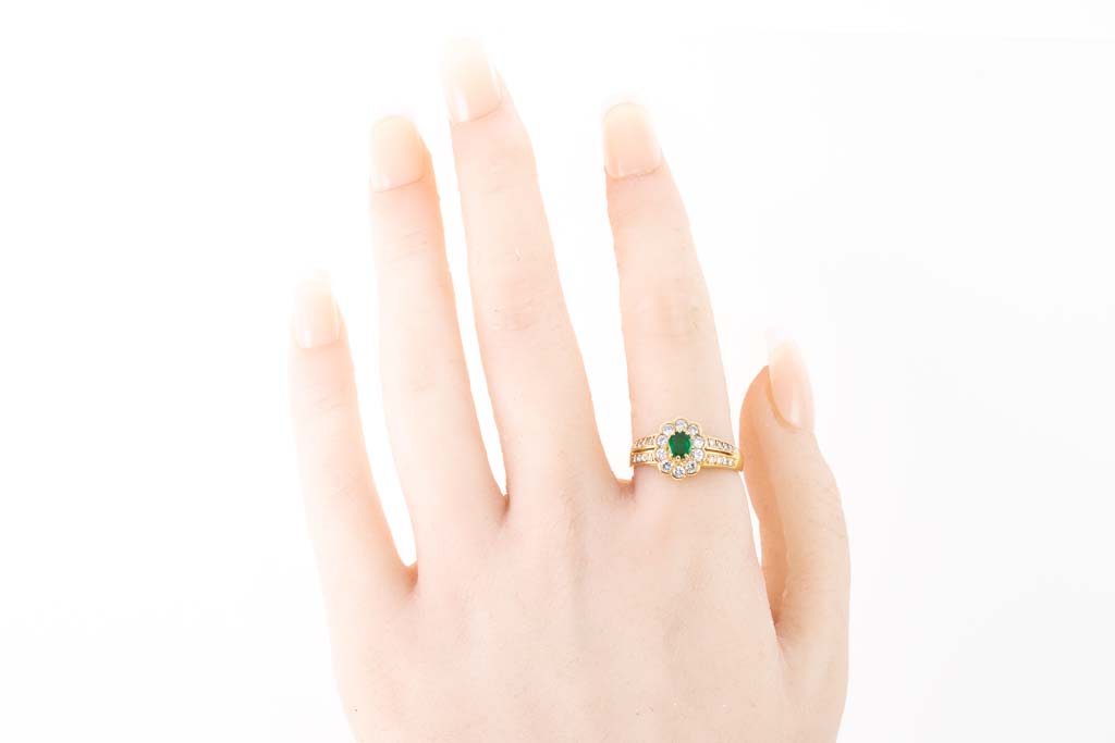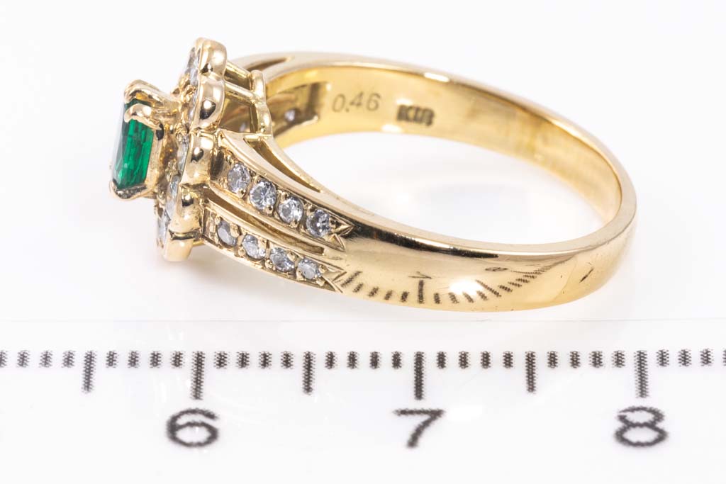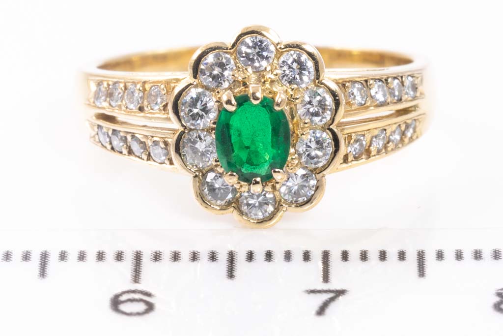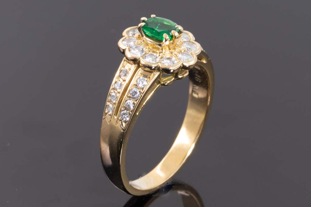 Emerald and Diamond ring with oval shape Emerald of 0.28ct and round Diamonds totalling 0.46cts (Estimated grading: G SI). 18ct yellow gold. Ring size N. Weight: 4.8g. (Pre-owned)