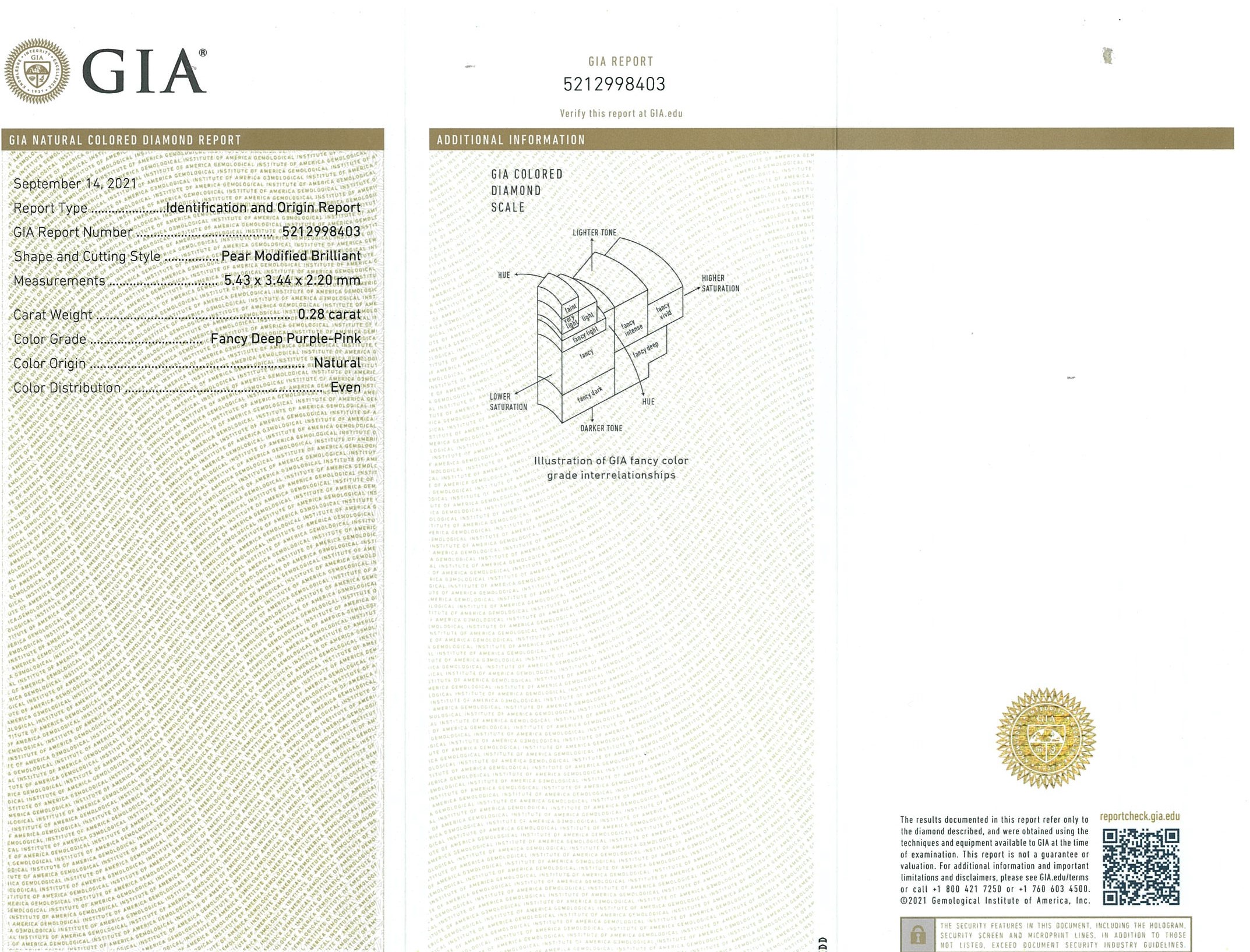 A loose pear shaped Diamond of 0.28ct (With GIA report graded as Natural Fancy Deep Purple-Pink Even #5212998403). (New)