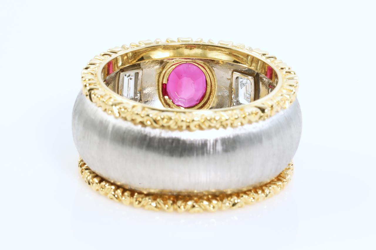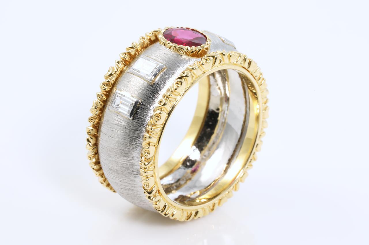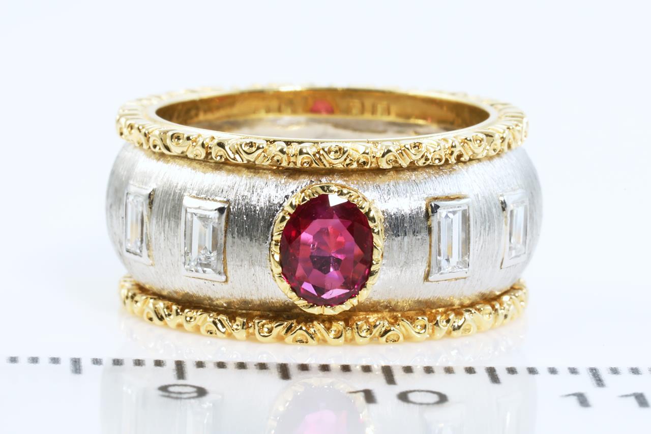 Ruby and Diamond ring with oval shape Ruby of approximately 0.28cts and 4 baguette cut Diamonds totalling approximately 0.36cts. Platinum and 18ct yellow gold. Ring size: L - ring resizing is not recommended. Weight: 9.30g (Pre-owned)