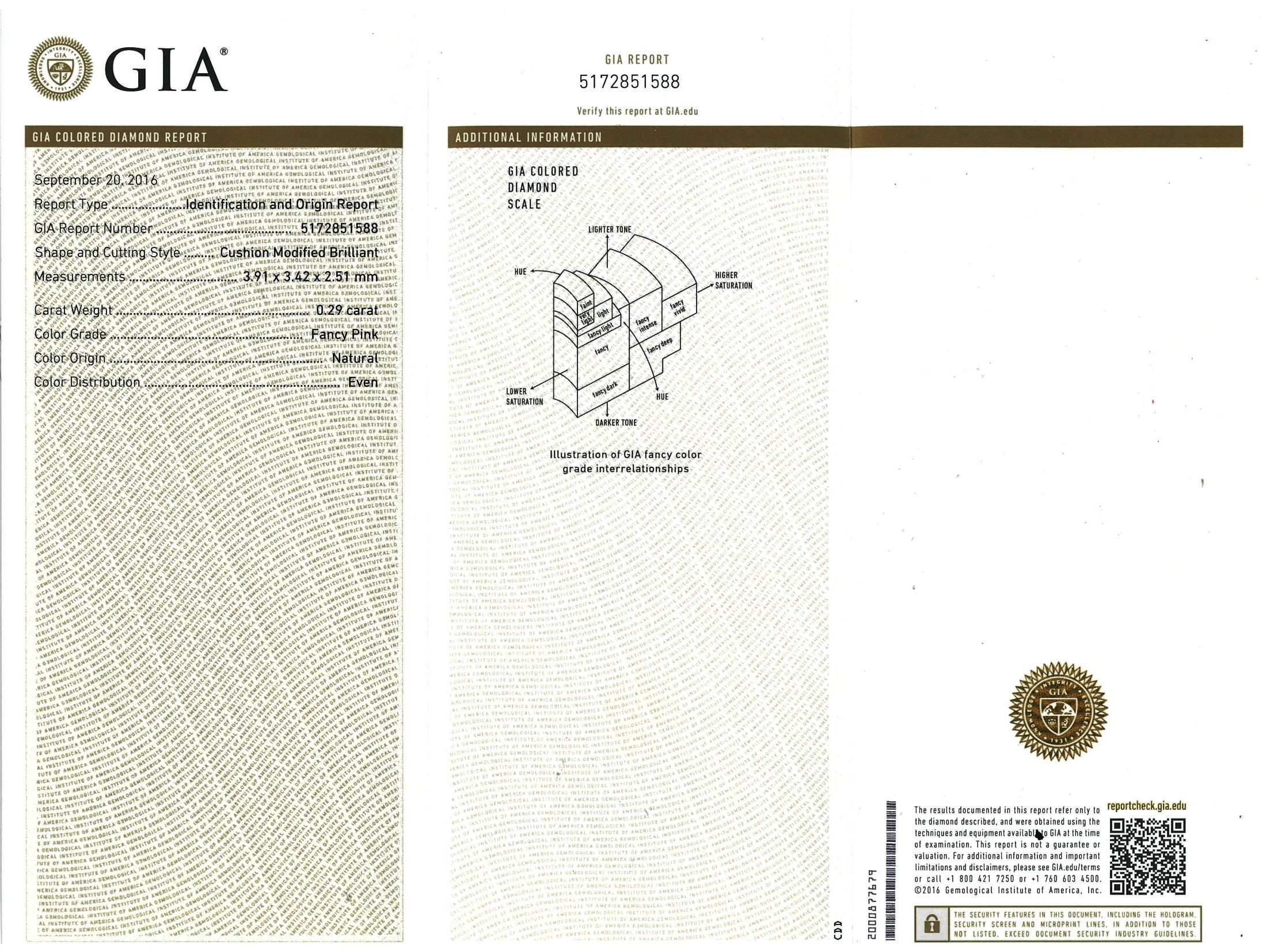 A loose cushion cut Diamond of 0.29ct (with GIA report graded as Natural Fancy Pink Even #5172851588). Estimated Clarity Grade: P2. (New)